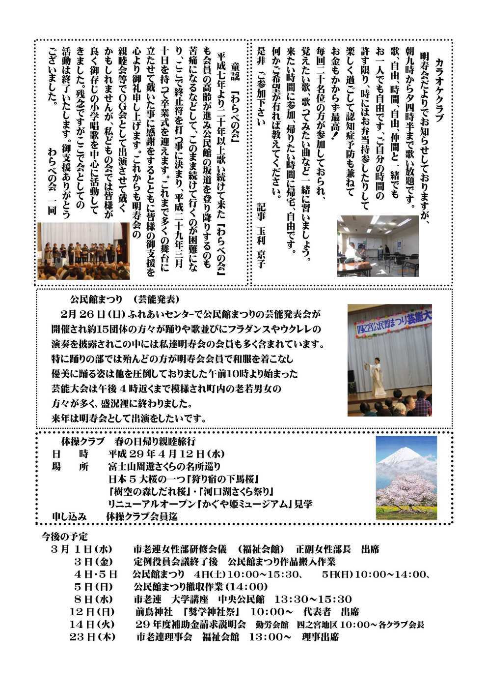 祈念祭( 五穀豊穣祭) 【 第五クラブ 親睦会】 ことぶき会( 舞踊の会) つるの会 ( 手芸) 体操クラブ活動記 【2面】 カラオケクラブ 童謡 「 わらべの会」 公民館まつり (芸能発表) 体操クラブ 春の日帰り親睦旅行 【今後の予定】 3月 1日(水) 市老連女性部研修会儀 (福祉会館) 正副女性部長 出席 3日(金) 定例役員会議終了後 公民館まつり作品搬入作業 4日・5日 公民館まつり 4日(土)10:00〜15:30、 5日(日)10:00〜14:00、 5日(日) 公民館まつり撤収作業(14:00) 8日(水) 市老連 大学講座 中央公民館 13:30〜15:30 12日(日) 前鳥神社 「奨学神社祭」 10:00〜 代表者 出席 14日(火) 29年度補助金請求説明会 勤労会館 四之宮地区10:00〜各クラブ会長 23日(木) 市老連理事会 福祉会館 13:00〜 理事出席 |