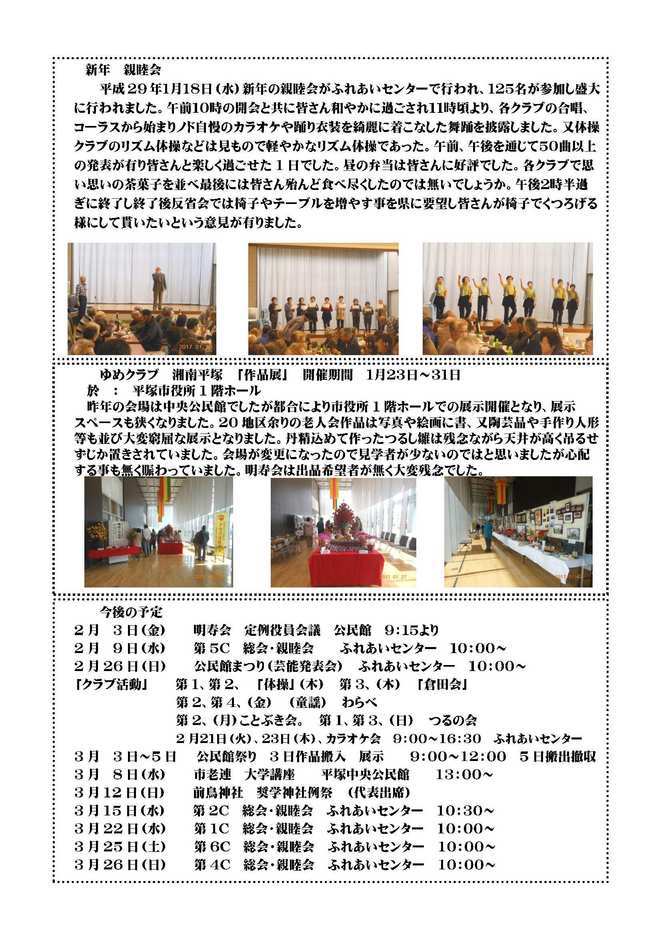 新年定例役員会議・賀詞交歓会 さくら幼稚園「園児とのふれあい 大野小学校 一年生 「昔ながらの遊び」 新入会員紹介 訃報 【2面】 新年 親睦会 ゆめクラブ 湘南平塚 「作品展」 開催期間 1月23日〜31日 【今後の予定】 2月 3日(金) 明寿会 定例役員会議 公民館 9:15より 2月 9日(水) 第5C 総会・親睦会 ふれあいセンター 10:00〜 2月26日(日) 公民館まつり(芸能発表会) ふれあいセンター 10:00〜 「クラブ活動」 第1、第2、 「体操」(木) 第3、(木) 「倉田会」 第2、第4、(金) (童謡) わらべ 第2、(月)ことぶき会。 第1、第3、(日) つるの会 2月21日(火)、23日(木)、カラオケ会 9:00〜16:30 ふれあいセンター 3月 3日〜5日 公民館祭り 3日作品搬入 展示 9:00〜12:00 5日搬出撤収 3月 8日(水) 市老連 大学講座 平塚中央公民館 13:00〜 3月12日(日) 前鳥神社 奨学神社例祭 (代表出席) 3月15日(水) 第2C 総会・親睦会 ふれあいセンター 10:30〜 3月22日(水) 第1C 総会・親睦会 ふれあいセンター 10:00〜 3月25日(土) 第6C 総会・親睦会 ふれあいセンター 10:00〜 3月26日(日) 第4C 総会・親睦会 ふれあいセンター 10:00〜 |