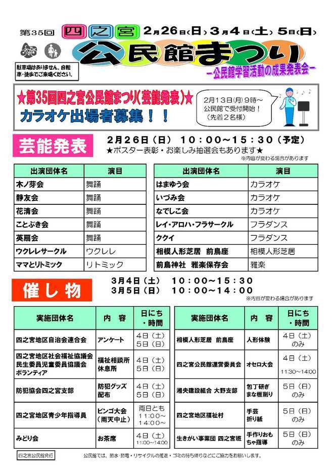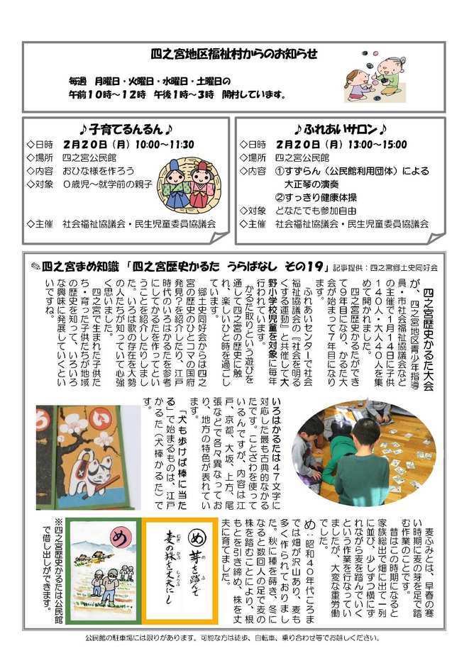 『深めよう!絆!!親子テニス教室』 3月29日(水) 10:00〜11:30 小学校低学年(1年〜3年) 13:00〜14:30 小学校高学年(4年〜6年) 桃浜テニスコート 交通安全協会四之宮支部が表彰されました! 【2面】【3面】 第35回四之宮公民館まつり (芸能発表) 2月26日(日) 10:00〜15:30(予定) ふれあいセンター カラオケ出場者場集!(先着2名) ポスター表彰、お楽しみ抽選会もあります! (作品展示・模擬店・催し物) 3月4日(土) 10:00〜15:30 3月5日(日) 10:00〜14:00 四之宮公民館 【4面】 『福祉村からのお知らせ』 開村日:毎週 月・火・水・土曜日 10:00〜12:00 13:00〜15:00 四之宮公民館 いこい室 『子育てるんるん』 2月20日(月) 10:00〜11:30 四之宮公民館 『ふれあいサロン』 2月20日(月) 13:00〜15:00 四之宮公民館 ☆四之宮まめ知識 「四之宮歴史かるた うらばなし その19」 |