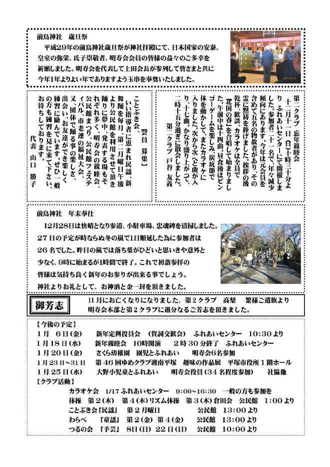明寿会 新年会長挨拶 【2面】 前鳥神社 歳旦祭 第二クラブ 忘年親睦会 ことぶき会 会員募集 前鳥神社 年末奉仕 御芳志 【今後の予定】 1月 6日(金) 新年定例役員会 (賀詞交歓会) ふれあいセンター 10:30より 1月18日(水) 新年親睦会 10時開演 2時30分終了 ふれあいセンター 1月20日(金) さくら幼稚園 園児とふれあい 明寿会6名参加 1月23日〜31日 第46回ゆめクラブ湘南平塚 趣味の作品展 平塚市役所1階ホール 1月25日(水) 大野小児童とふれあい 明寿会役員(34名程度参加) 社協他 【クラブ活動】 カラオケ会 1/17ふれあいセンター 9:00〜16:30 一般の方も参加を 体操 第2(木) 第4(木)リズム体操 第3(木)倉田会 公民館 1:00より ことぶき会「民謡」 第2月曜日 公民館 13:00より わらべ 「童謡」 第2(金) 第4(金) 公民館 13:00より つるの会 「手芸」 8日(日) 22日(日) 公民館 10:00より |