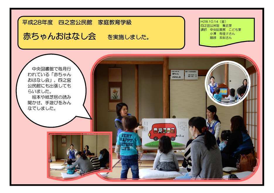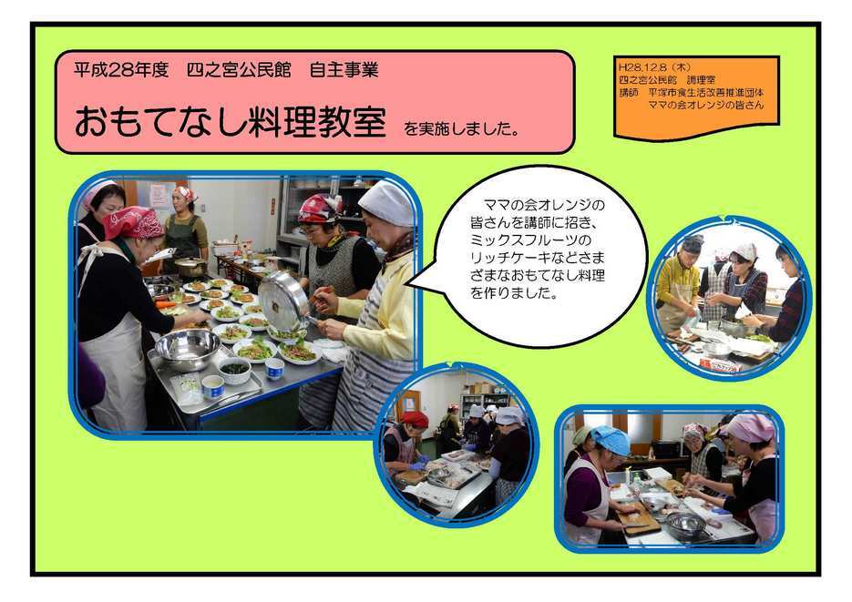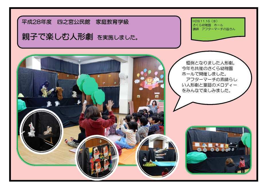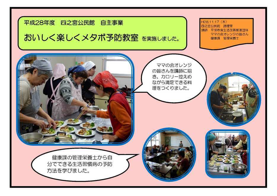 高齢者のいきいき料理教室 10月6日(木) 講師にママの会オレンジの皆さんをお招きし、和気あいあいと栄養バランスのとれた彩り豊かな食事をつくりました。 食後には舌や顔を使った体操をしました。 赤ちゃんおはなし会 10月14日(金) 中央図書館で毎月行われている「赤ちゃんおはなし会」。四之宮公民館にも出張してもらいました。 絵本や紙芝居の読み聞かせ、手遊びをみんなでしました。 親子で楽しむ人形劇 11月16日(水) 恒例となりました人形劇。今年も共催のさくら幼稚園ホールで開催しました。 アフターマーチの素晴らしい人形劇と童謡のメロディーをみんなで楽しみました。 おいしく楽しくメタボ予防教室 11月17日(木) ママの会オレンジの皆さんを講師に招き、カロリー控えめながら満足できる料理をつくりました。食後には健康課の管理栄養士から自分でできる生活習慣病の予防方法を学びました。 事業に参加していただいたみなさま、ありがとうございました。 |