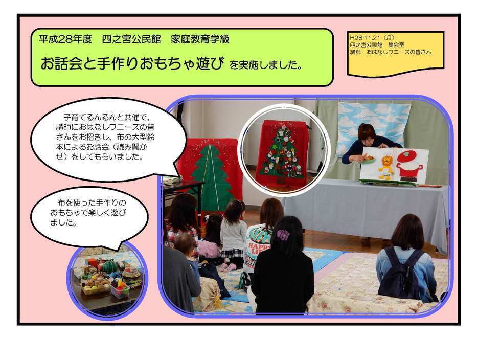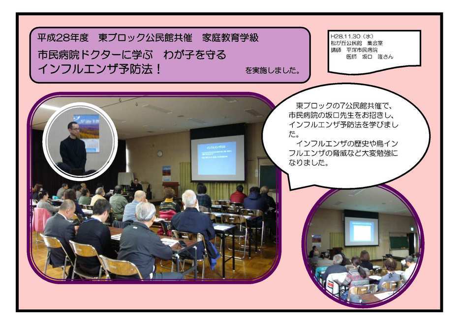 三世代交流パークゴルフ大会 11月20日(日) 今年も公民館まつりの皮切りイベントとして実施しました。快晴で暖かい日差しのなか、元気いっぱいに楽しむことができました。地域の人たちとふれあうとても良い時間になったかと思います。 お話会と手作りおもちゃ遊び 11月21日(月) 子育てるんるんと共催で、講師におはなしワニーズの皆さんをお招きし、布の大型絵本によるお話会(読み聞かせ)をしてもらいました。そのあとは布を使った手作りのおもちゃで楽しく遊びました。 市民病院ドクターに学ぶ わが子を守る インフルエンザ予防法! 11月30日(水) 東ブロックの7公民館共催で、市民病院の坂口先生をお招きし、インフルエンザ予防法を学びました。 インフルエンザの歴史や鳥インフルエンザの脅威など大変勉強になりました。 おもてなし料理教室 12月8日(木) ママの会オレンジの皆さんを講師に招き、ミックスフルーツのリッチケーキなどさまざまなおもてなし料理を作りました。 事業に参加していただいたみなさま、ありがとうございました。 |