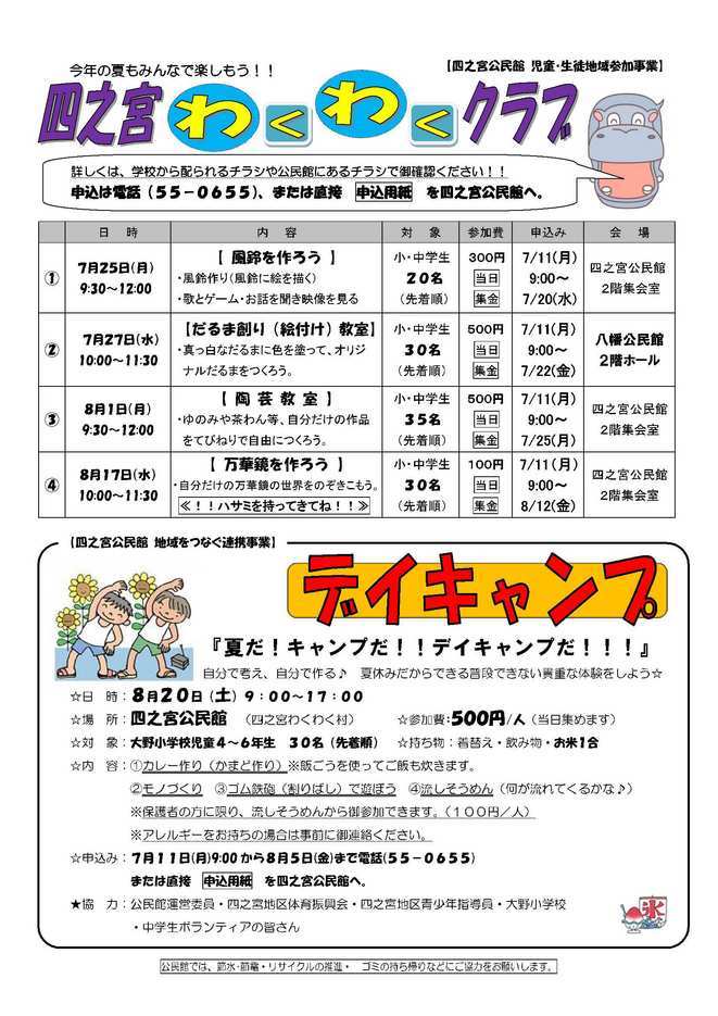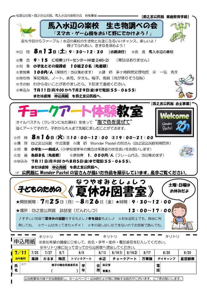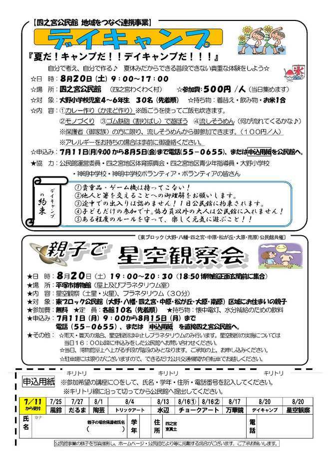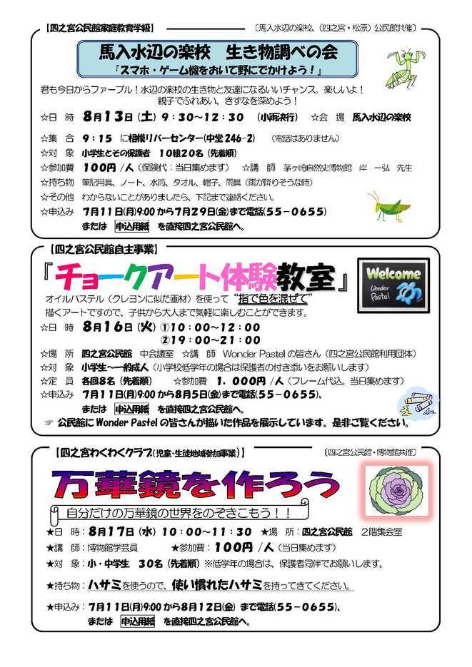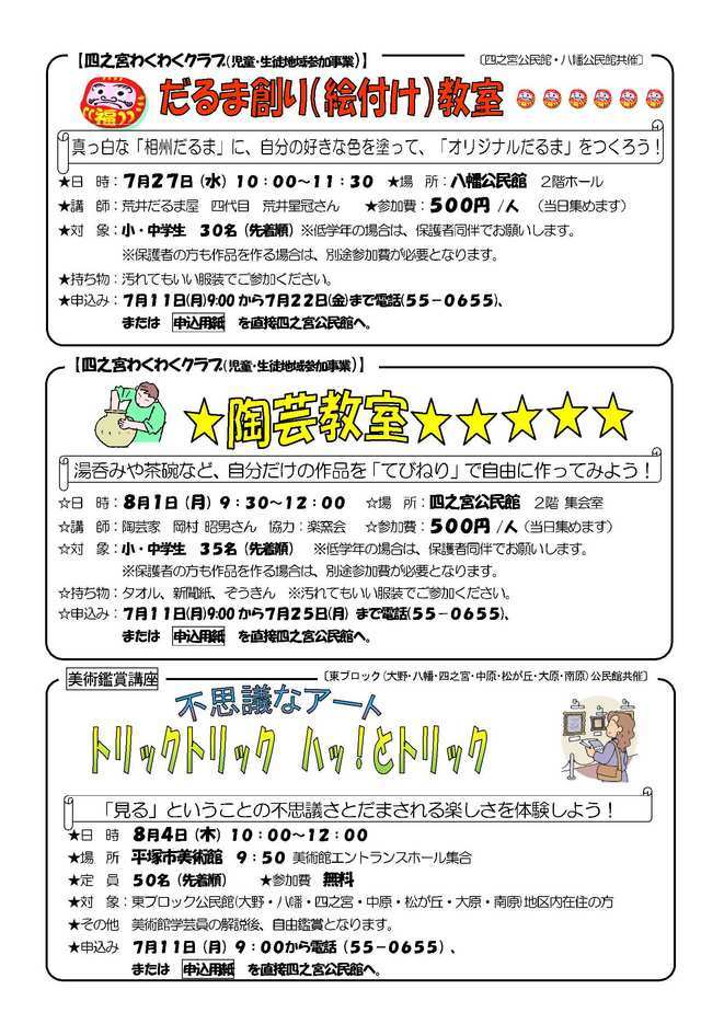 ☆『不思議なアート トリックトリック ハッと!トリック』 8月4日(木)10:00〜12:00 美術館 ☆『親子で星空観察会』 8月20日(土)19:00〜20:30 博物館 【2面】 ☆『四之宮わくわくクラブ』 『風鈴を作ろう』 7月25日(月) 9:30〜12:00 『だるま創り(絵付け)教室』 7月27日(水)10:00〜11:20 八幡公民館 『陶芸教室』 8月 1日(月) 9:30〜12:00 『万華鏡を作ろう』 8月16日(火)10:00〜11:30 ☆『デイキャンプ』 8月20日(土) 9:00〜17:00 ◎内容◎ ・カレー作り(カマド作り)・モノ作り ・ゴム鉄砲(割りばし)で遊ぼう・流しそうめん 等 ※アレルギーをお持ちの場合は事前にお知らせください。 【3面】 ☆『馬入水辺の楽校 生き物調べの会』 8月13日(土) 9:30〜12:30 馬入水辺の楽校 ☆『チョークアート体験教室』 8月16日(火)@10:00〜12:00 A19:00〜21:00 ☆『子どものための≪夏休み図書室≫』 7月25日(月)〜8月26日(金) 9:30〜12:00 13:00〜17:00 【4面】 ☆7月の囲碁ボール 7月20日(水) 14:00〜16:00 ☆第18回ふれあい夏まつり大会 日時:8月6日(土)、7日(日)17:00〜20:30 場所:大野小学校 ☆ふれあいサロン 日時:7月18日(月・祝)13:00〜15:00 内容:おはなし会 ☆平和祈念祭の開催について 日時:8月15日(月)9:00〜 場所:前鳥神社殉国碑前 ☆四之宮まめ知識 「番外編 相模十三座巡り その4」 |