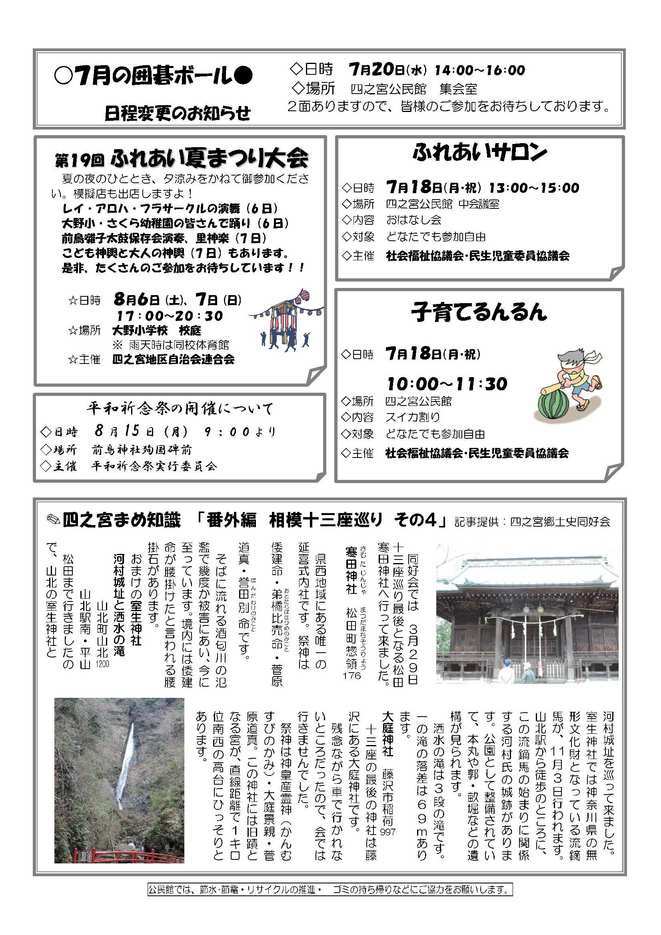 本号では、5月に行われました日赤募金運動実績の結果発表と その御礼、7月に行われる社協賛助会員加入と募金のお願い、 7月〜9月の社協行事カレンダー、子育てるんるん、移動ふれ あいサロン開催の報告等です。