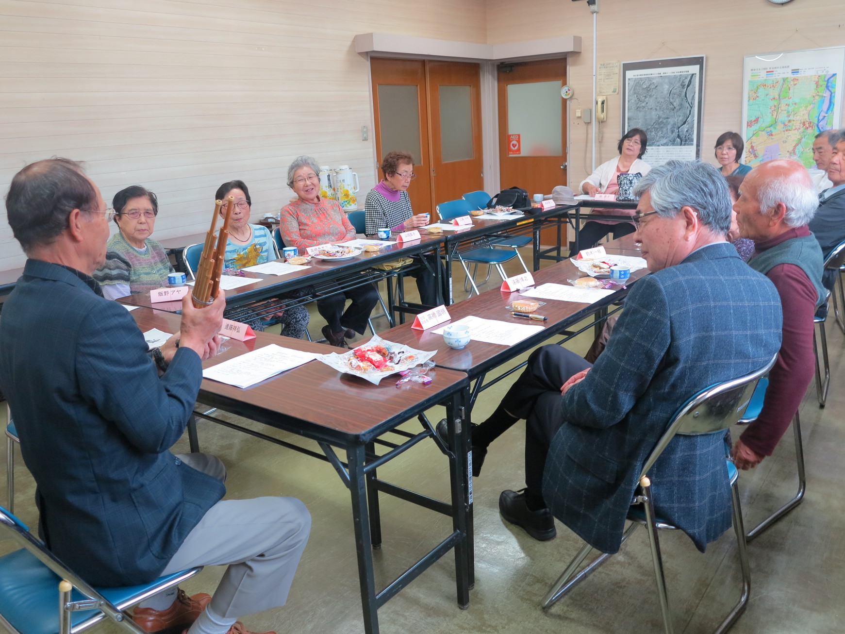 4月のふれあいサロンは、4月18日(月)13:00〜14:30公民館で開催され13名の出席者がありました。講師には四之宮地区社会福祉協議会の新会長となられた進藤祥弘にお願いして、「雅楽から来たと云われる言葉について」と題して、仏教伝来と軌を一にして公家文化の一翼を担うこととなった雅楽を介して伝播したといわれる日本語の数々を紹介していただきました。氏は前鳥神社で永らく役員を務められ、その間雅楽保存会にも参加されて楽器にも習熟された方で、会場に笙を持参され、実演まで見させていただきました。“頭取”、“打合せ”、“塩梅”、“楽屋”、“こつ”、“野暮”、“うまい”、“さまになっている”、“ぎっちょ”、“打ち止め”、“千秋楽”等々雅楽から出たといわれる言葉は枚挙にいとまがないくらいあり、その由来について説明され、何れも初耳の話ばかりで大変ためになる1時間半でした。今後のふれあいサロンについても、一方的に聞かされるような形でなく、今回のような“みんなが楽しく参加できる形のサロン”が望ましいというのが皆様のご意見で、今後ともそのような演目や構成、やり方を考えていきたいと思います。