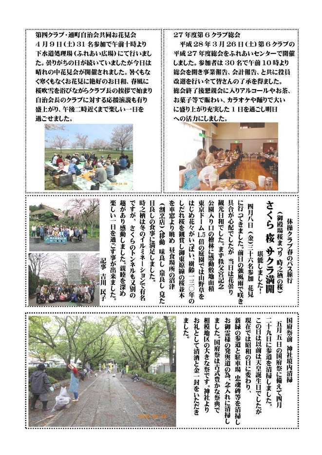 ○明寿会総会の開催について ○春季ゆめクラブ湘南平塚研修旅行について ○平成27年度女性部役員研修会の報告 ○新入会員の紹介 ○訃報のお知らせ 【2面】 ○27年度第6クラブ総会の報告 ○第四クラブ・通町自治会共同お花見会の報告 ○体操クラブ春のバス旅行の報告 ○国府祭前 神社境内清掃の報告 |