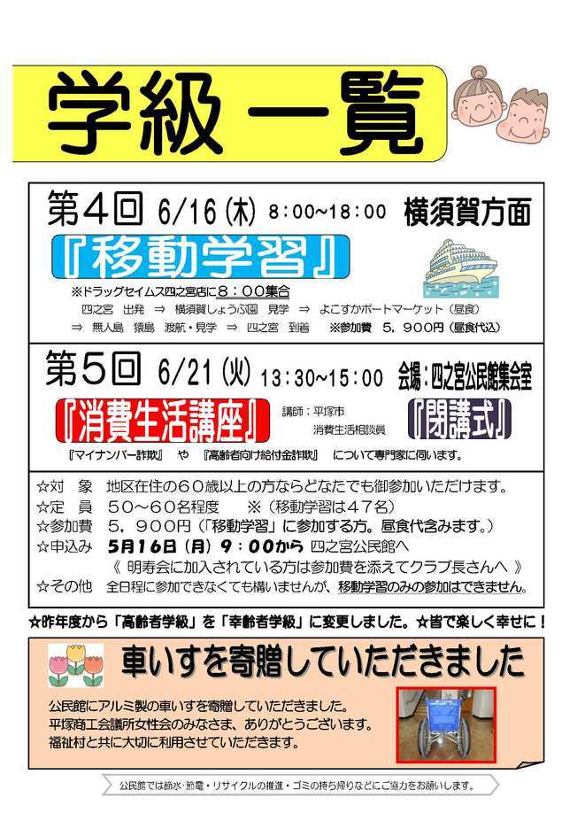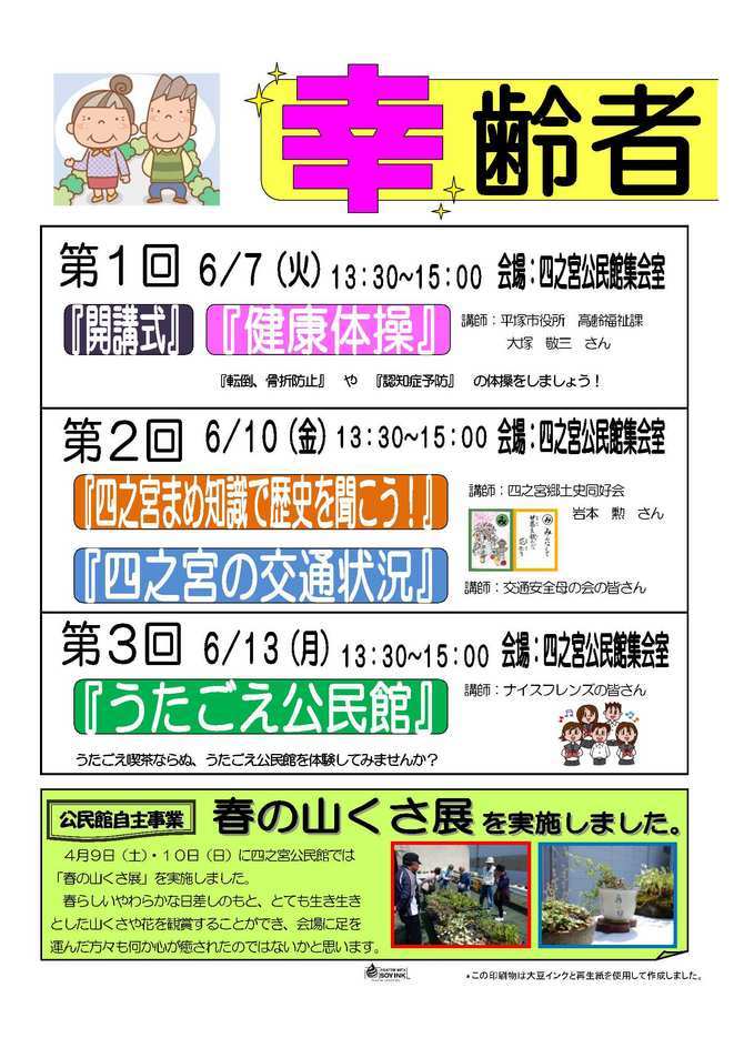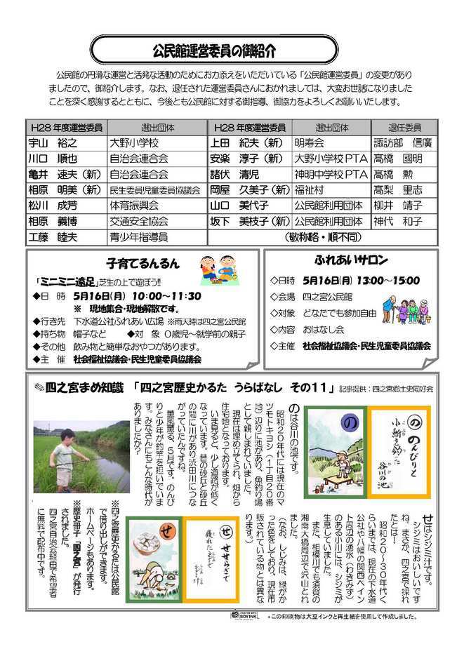 ☆『〜市外ハイキング2016〜城山・高尾山に挑戦!』 ☆『パパと子どもシェフが作る 父の日特製ナンカレー』 【2面】 ☆『“幸”齢者学級一覧』 ☆『春の山くさ展を実施しました』 【3面】 ☆『“幸”齢者学級一覧』 ☆『車いすを寄贈していただきました』 【4面】 ☆公民館運営委員の御紹介 ☆子育てるんるん ◎「ミニミニ遠足」芝生の上で遊ぼう!◎ 5月16日(月)10:00〜 下水道公社ふれあい広場 ☆ふれあいサロン ◎おはなし会◎ 5月16日(月)13:00〜 四之宮公民館 ☆四之宮まめ知識 「四之宮歴史かるた うらばなし その11」 |
