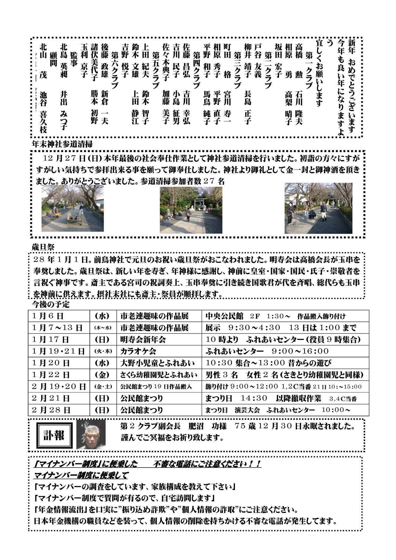 ○新年のご挨拶 【2面】 ○各クラブ役員紹介 ○年末神社参道清掃の報告 ○歳旦祭の報告 ○今後の予定 1月 6日(水) 市老連趣味の作品展(作品搬入) 1月 7日 〜13日 市老連趣味の作品展(中央公民館) 1月17日(日) 明寿会新年会(ふれあいセンター) 1月19・21日 カラオケ会(ふれあいセンター) 1月20日(水) 大野小児童とふれあい 1月22日(金) さくら幼稚園児とふれあい 2月19・20日 公民館まつり(作品展示・模擬店等) 2月28日(日) 公民館まつり(芸能発表)ふれあいセンター ○訃報 ○注意喚起 |