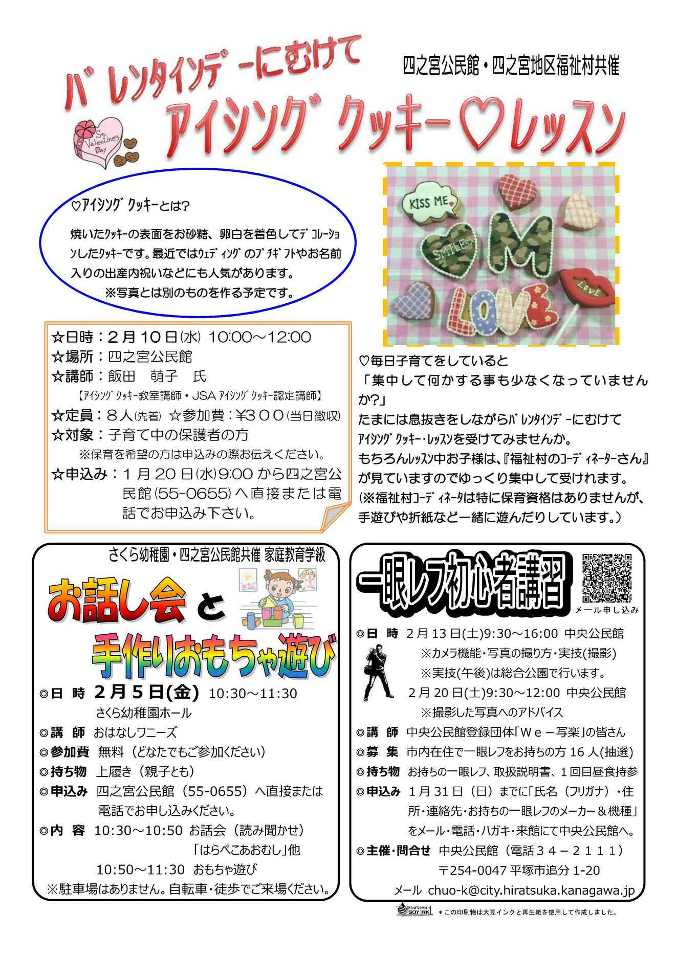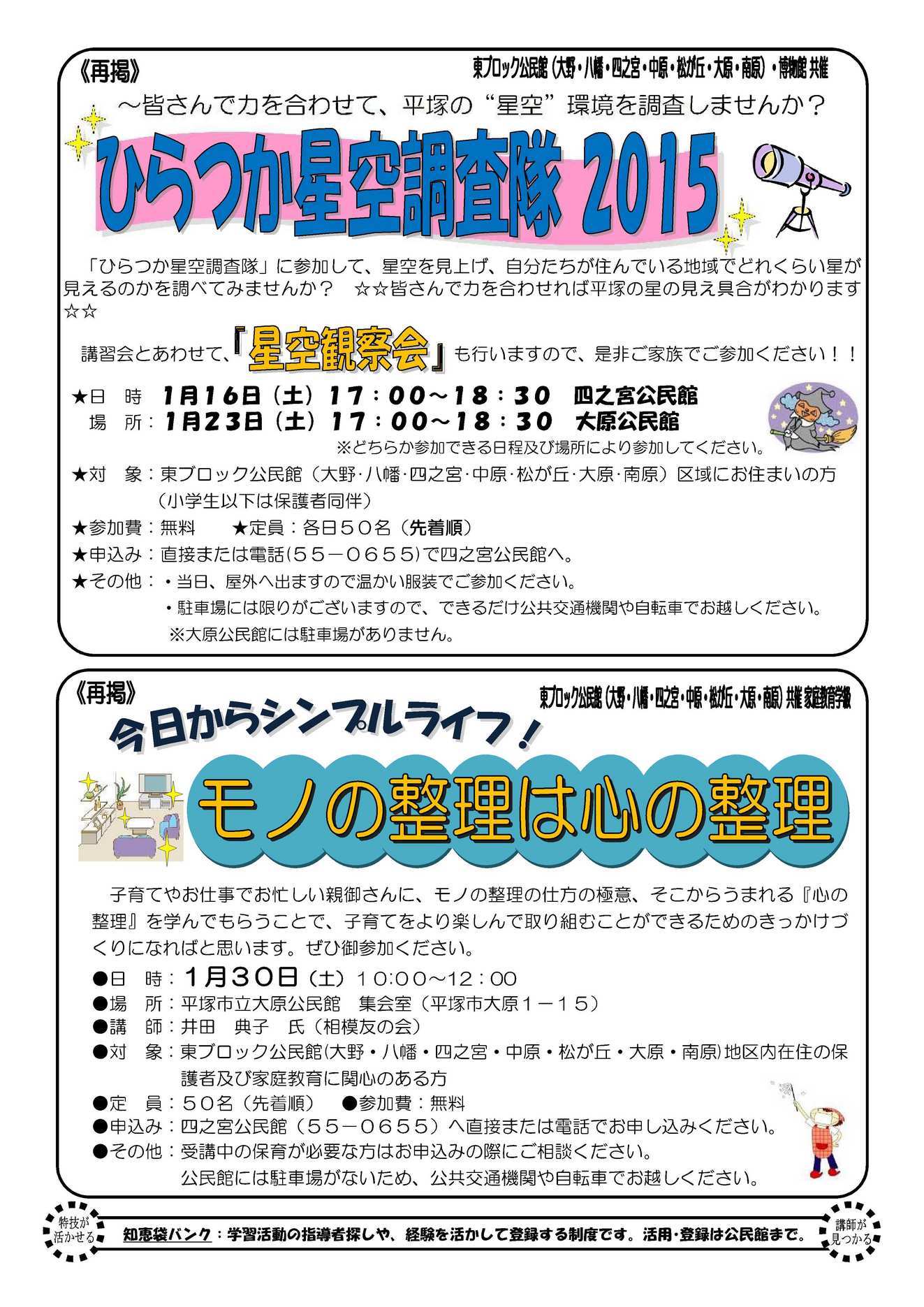 ☆新年あけましておめでとうございます 本年もよろしくお願いいたします ☆四之宮公民館まつり日程決定!! 作品展示・模擬店等 2月20日(土)10:00〜15:30 21日(日)10:00〜14:30 ※会場:四之宮公民館 芸能発表 2月28日(日)10:00〜 ※会場:四之宮ふれあいセンター 【2面】 ☆『〜バレンタインデーに向けて〜 アイシングクッキー♡レッスン』 2月10日(水)10:00〜12:00 四之宮公民館 ☆『お話会と手作りおもちゃ遊び』 2月 5日(金)10:30〜11:30 さくら幼稚園 ☆『一眼レフ初心者講習』 2月13日(土) 9:30〜16:00 中央公民館 2月20日(土) 9:30〜12:00 中央公民館 【3面】 ☆《再掲》『平塚星空調査隊2015』 1月16日(土)17:00〜18:30 四之宮公民館 1月23日(土)17:00〜18:30 大原公民館 ☆《再掲》『〜今日からシンプルライフ〜 モノの整理は心の整理』 1月30日(土)10:00〜 大原公民館 【4面】 ☆大掃除・障子張り替えのお礼 ☆四之宮地区福祉村 囲碁ボールの実施 1月13日(水)10:00〜12:00 四之宮公民館 ☆子育てるんるん ◎リンパマッサージ◎ 1月18日(月)10:00〜 四之宮公民館 ☆ふれあいサロン ◎懐メロを聴こう◎ 1月18日(月)13:00〜 四之宮公民館 ☆四之宮まめ知識 「四之宮歴史かるた うらばなし その7」 |