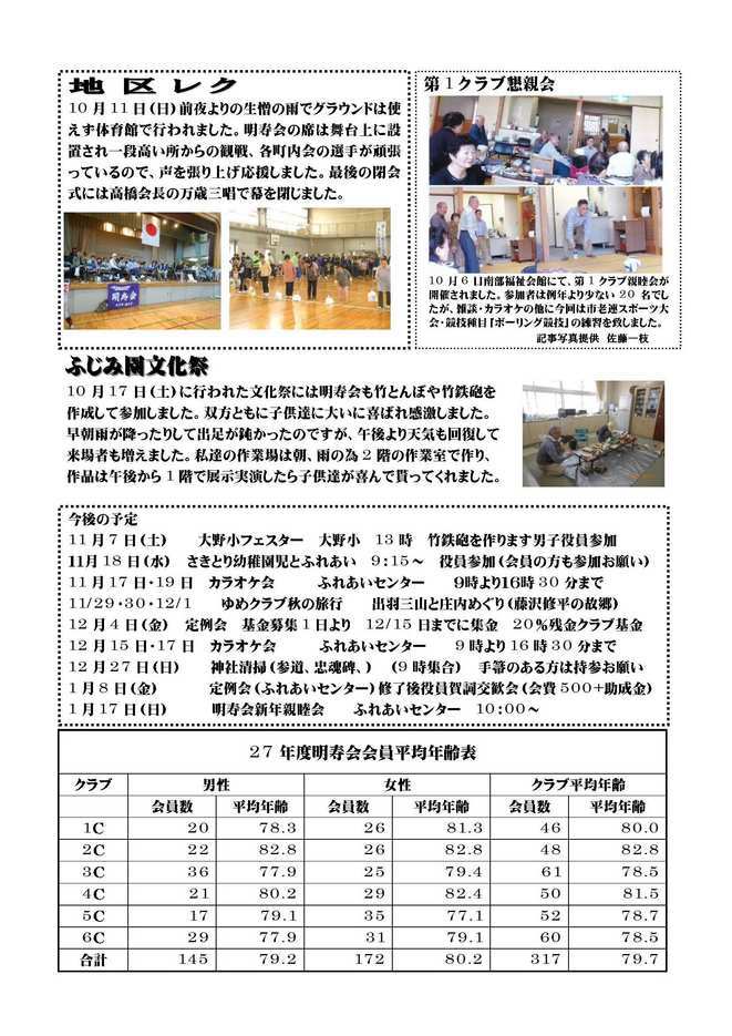 ○傘寿祝賀会報告 ○第43回ゆめクラブ湘南平塚スポーツ大会報告 ○訃報 【2面】 ○地区レク報告 ○第1クラブ懇親会報告 ○ふじみ園文化祭報告 ○今後の予定 11月 7日(土) 大野フェスタ 11月18日(水) さきとり幼稚園児とふれあい 11月17・19日 カラオケ会 11月29〜 12月 1日 ゆめクラブ秋の研修旅行(山形出羽三山神社) 12月 4日(金) 定例会 12月15・17日 カラオケ会 12月27日(日) 神社清掃 1月 8日(金) 定例会(ふれあいセンター) 1月17日(日) 明寿会新年親睦会 ○27年度明寿会会員平均年齢表 |