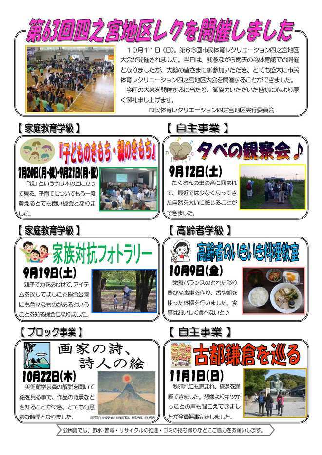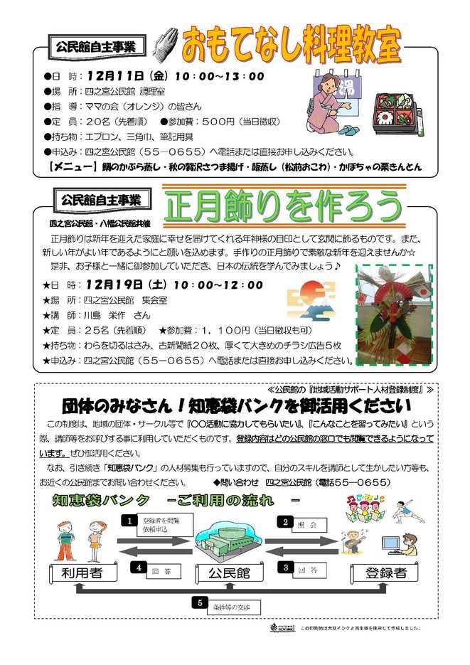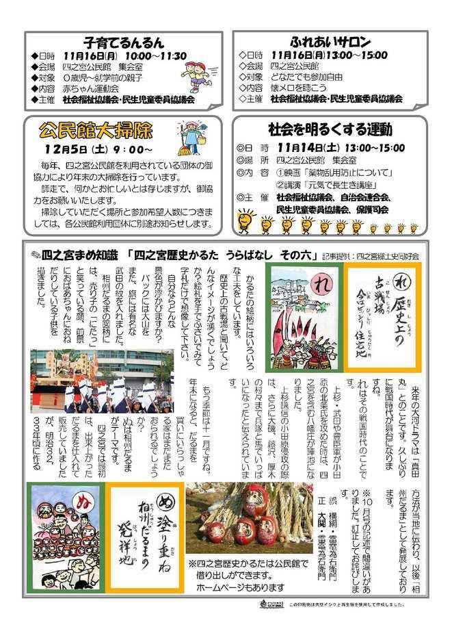 ☆『社交ダンスを楽しもう〜Shall We Dance?〜』 12月13日(日)14:00〜16:30 中央公民館 【2面】 ☆『おもてなし料理教室』 12月11日(金)10:00〜 四之宮公民館 ☆『正月飾りを作ろう』 12月19日(土)10:00〜 四之宮公民館 ☆知恵袋バンクの案内(地域活動人材登録制度) 【3面】 ☆『第63回市民体育レクリエーション開催報告』 ☆『公民館事業報告』 ◎子どものきもち・親のきもち(家庭教育学級) ◎夕べの観察会(自主事業) ◎家族対抗 フォトラリー(家庭教育学級) ◎高齢者のいきいき料理教室(高齢者学級) ◎画家の詩、詩人の絵(ブロック事業) ◎古都鎌倉を巡る(自主事業) 【4面】 ☆子育てるんるん 日時:11月16日(月)10:00〜 四之宮公民館 ☆ふれあいサロン 日時:11月16日(月)13:00〜 四之宮公民館 ☆公民館大掃除 日時:12月 5日(土) 9:00〜 四之宮公民館 ☆社会を明るくする運動 日時:11月14日(土)13:00〜 四之宮公民館 ☆四之宮まめ知識 「四之宮歴史かるた うらばなし その六」 |