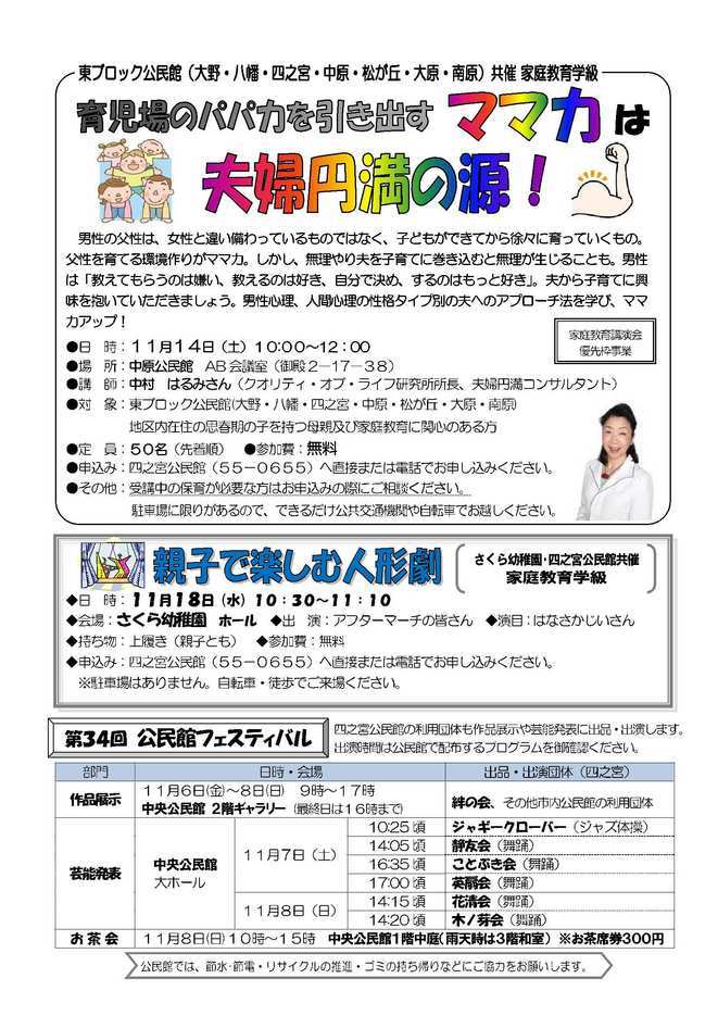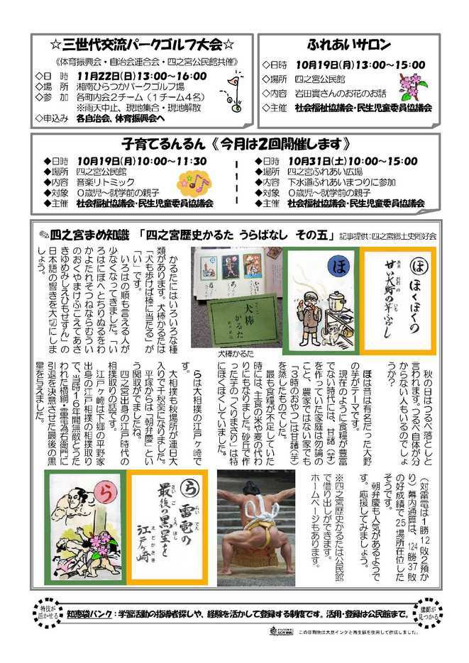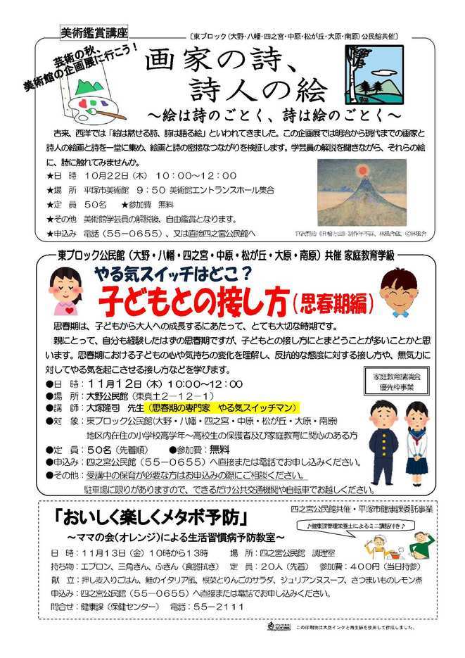 ☆〜市外ハイキング2015〜 『古都鎌倉を巡る』 11月 1日(日) 8:30〜16:30(予定) ☆《家庭教育講演会》『思春期の心と親心』 12月 5日(土)14:00〜15:30 中央公民館 ◎講師:名越 康文 氏(精神科医) 【2面】 ☆『画家の詩、詩人の絵』 10月22日(木)10:00〜 美術館 ☆やる気スイッチはどこ?『子どもとの接し方(思春期編)』 11月12日(木)10:00〜 大野公民館 ☆『おいしく楽しくメタボ予防』 11月13日(金)10:00〜 四之宮公民館 【3面】 ☆『育児場のパパ力を引き出すママ力は夫婦円満の源!』 11月14日(土)10:00〜 中原公民館 ☆『親子で楽しむ人形劇』 11月18日(水)10:30〜 さくら幼稚園 ☆『第34回公民館フェスティバル』 【4面】 ☆三世代交流パークゴルフ大会 日時:11月22日(日)13:00〜16:00 湘南ひらつかパークゴルフ場 ☆ふれあいサロン 日時:10月19日(月)13:00〜 四之宮公民館 ☆子育てるんるん 日時:10月19日(月)10:00〜 四之宮公民館 10月31日(土)10:00〜 四之宮ふれあい広場 ☆四之宮まめ知識 「四之宮歴史かるた うらばなし その五」 |