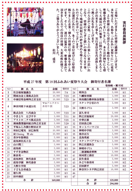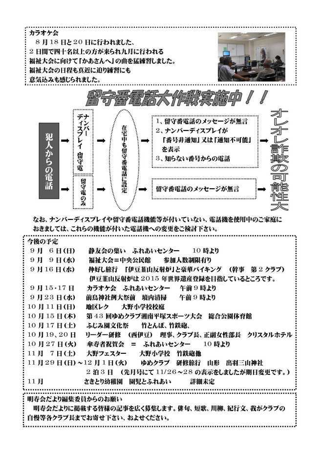 ○平和祈念祭 ○中庭地区親睦会参加して ○中庭地区納涼会に参加して ○第3クラブ夏の懇親会報告 ○新入会員紹介 【2面】 ○カラオケ会報告 ○留守番電話大作戦実施中!! ○今後の予定 9月 6日(日) 静友会の集い 9月 9日(水) 福祉大会 9月16日(水) 仲好し旅行「伊豆韮山反射炉」 9月15・17日 カラオケ会 9月23日(水) 前鳥神社例大祭 境内清掃 10月11日(日) 地区レク 10月15日(木) 第43回ゆめクラブ湘南平塚スポーツ大会 10月17日(土) ふじみ園文化祭 10月19・20日 リーダー研修(西伊豆) 10月27日(火) 傘寿祝賀会 11月 7日(土) 大野フェスタ 11月29〜 12月1日 ゆめクラブ研修旅行(山形 出羽三山神社) 11月 さきとり幼稚園 園児とふれあい(詳細未定) |