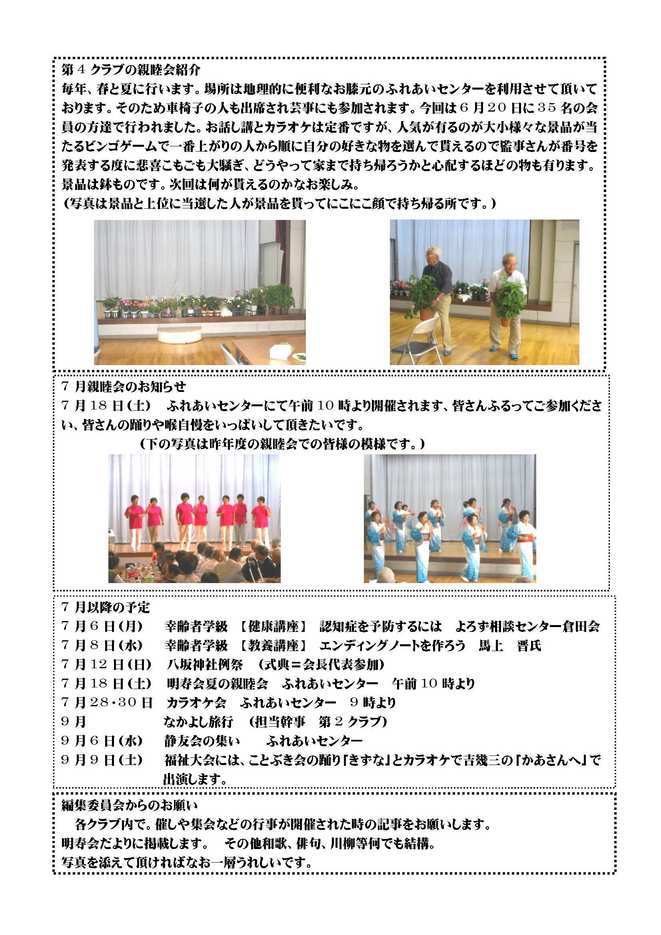 ○幸齢者学級始まる ○移動教室 ○カラオケ会 ○新入会員紹介 ○訃報のお知らせ 【2面】 ○第4クラブの親睦会紹介 ○7月親睦会のお知らせ 7月18日(土)10:00〜 ふれあいセンター ○7月以降の予定 7月 6日(月) 幸齢者学級「認知症を予防しよう」 7月 8日(水) 幸齢者学級「エンディングノートを作ろう」 7月12日(日) 前鳥神社八坂神社例祭 7月18日(土) 夏の親睦会 7月28・30日 カラオケ会 9月 なかよし旅行 9月 6日(水) 静友会の集い 9月 9日(土) 福祉大会 ○編集委員からのお願い |