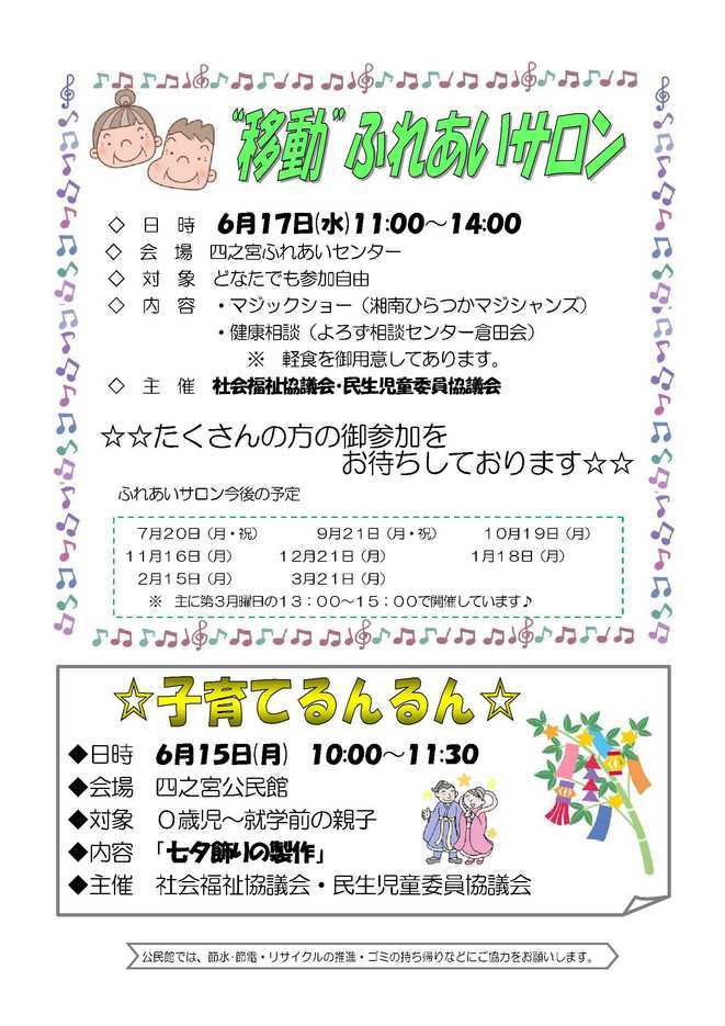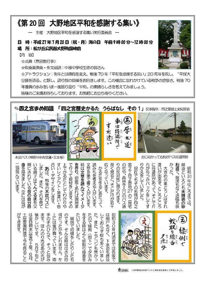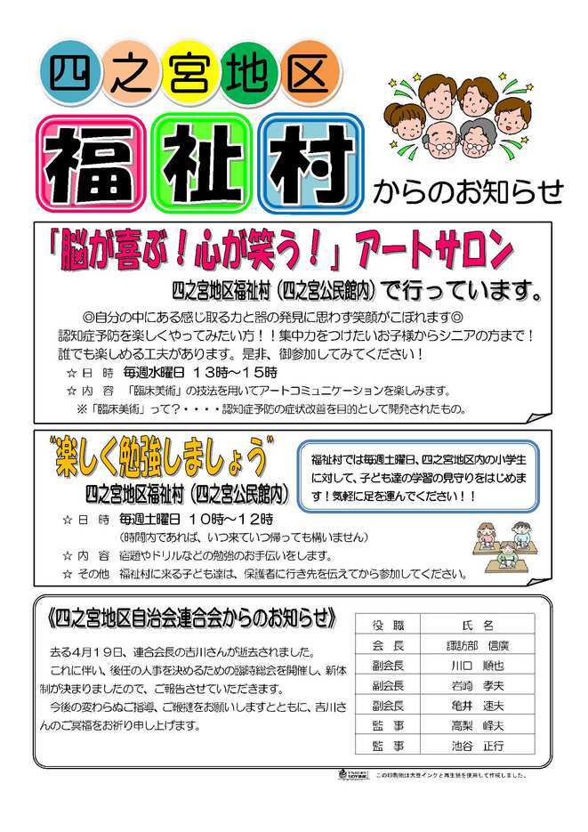 ☆『公民館ではこんなサークルが活動しています』 ・公民館で活動するサークル(学習サークル)一覧 【2面】 ☆四之宮地区福祉村からのお知らせ 『脳が喜ぶ!心が笑う!』アートサロンを行っています。 日時:毎週水曜日 13時〜15時 『楽しく勉強しましょう』 日時:毎週土曜日 10時〜12時 ☆四之宮地区自治会連合会からのお知らせ ・新体制のご報告 【3面】 ☆移動ふれあいサロン 日時:6月17日(水)11時〜14時 会場:四之宮ふれあいセンター 内容:マジックショー・健康相談 ☆子育てるんるん 日時:6月15日(月)10時〜11時30分 内容:「七夕飾りの制作」 【4面】 ☆第20回 大野地区平和を感謝する集い 日時:7月20日(祝・月)海の日 9時〜12時 場所:松が丘公民館大野殉国碑前 ☆四之宮まめ知識 「四之宮歴史かるた うらばなし その1」 |