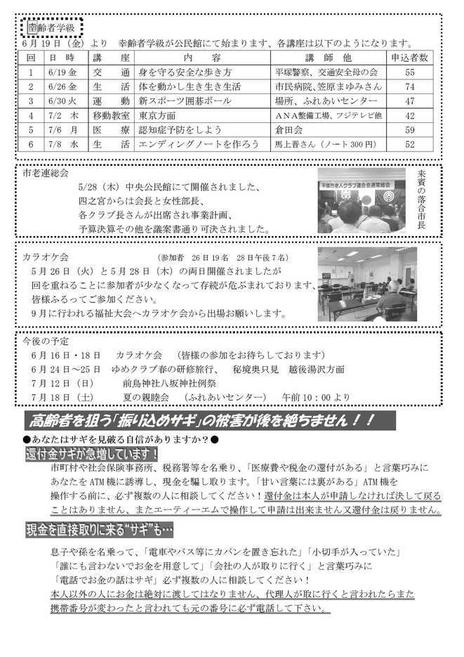 ○新旧役員引き継ぎ研修旅行の報告 5月19日〜20日両日参加者21名にて山梨県下部温泉で実施。 ○国府祭参加報告 ○新入会員の紹介 ○会員募集 ・つるの会 ・ことぶき会 ○御芳志の報告 ○訃報のお知らせ 【2面】 ○幸齢者学級の日程 6月19日(金)【交通】「身を守るための安全な歩き方」 6月26日(金)【生活】「体を動かし、いきいき生活」 6月30日(火)【運動】「はじめての囲碁ボール」 7月 2日(火)【移動教室】「移動学習(ANA機体整備工場他」 7月 6日(月)【医療】「認知症を予防しよう」 7月 8日(水)【生活】「エンディングノートを作ろう」 ○市老連総会報告 ○カラオケ会報告・参加募集 ○今後の予定 6月16日・18日 カラオケ会 6月24日・25日 ゆめクラブ春の研修旅行 7月12日(日) 前鳥神社八坂神社例祭 7月18日(土) 夏の親睦会 ○「振り込めサギ」への注意喚起 |