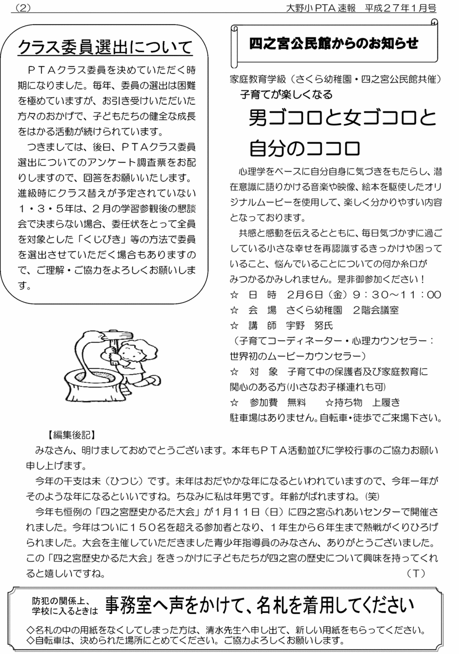 ☆新年挨拶【略】 ☆うがい・手洗い忘れずに! ☆1月の子どもたち ・1/8:授業開始 ・1/9:給食開始 ・1/11:四之宮歴史かるた大会 ・1/14:修学旅行(6年) ・1/14:身体計測(1・2年) ・1/15:身体計測(3・4年) ・1/15:昔の遊び(1年) ・1/16:身体計測(5・6年) ・1/16:火災避難訓練 ・1/20:さくら幼稚園との交流(2年) ・1/20:クラブ ・1/23:薬物乱用防止教室(5・6年) ・1/27:神明中部活動見学(6年) ・1/29:みどり保育所交流(1年) ☆各委員会1月の活動予定○本部・10:四之宮地区賀詞交換会・11:四之宮歴史かるた大会・27:新1年生入学説明会 ○学年学級・21:委員会 ○教養・15:委員会 ○広報・14:委員会 ○地区・16:委員会 *2月7日(土曜)10時から 運営委員会・・ ☆2月の予定 2/19:授業参観、懇談会(支、1,3,5 年)・2/20:授業参観、懇談会(2,4,6年)・2/26:6年生を送る会 p.2 ☆クラス委員選出について ・PTAクラス委員を決めていただく時期になりました。毎年、委員の選出は困難を極めていますが、お引き受けいただいた方々のおかげで、子どもたちの健全な成長をはかる活動が続けられています。つきましては、後日、PTAクラス委員選出についてのアンケート調査票をお配りしますので、回答をお願いいたします。進級時にクラス替えが予定されていない1・3・5年は、2 月の学習参観後の懇談会で決まらない場合、委任状をとって全員を対象とした「くじびき」等の方法で委員を選出させていただく場合もありますので、ご理解・ご協力をよろしくお願いします ☆四之宮公民館からのお知ら せ・家庭教育学級(さくら幼稚園・四之宮公民館共催)子育てが楽しくなる男ゴコロと女ゴコロと自分のココロ ・日時:2月6日(金)9:30〜11:00 ・会場:さくら幼稚園2階 ・講師:宇野努氏(子育てコーディネーター・心理カウンセラー:世界初のムービーカウンセラー) ・対象:子育て中の保護者及び家庭教育に関心のある方(小さなお子様連れも可) ・参加費:無料 ・持ち物 上履き ・駐車場はありません。自転車・徒歩でご来場下さい。 ☆【編集後記】【略】 ☆防犯の関係上、 学校に入るときは事務室へ声をかけて、名札を着用してください |
