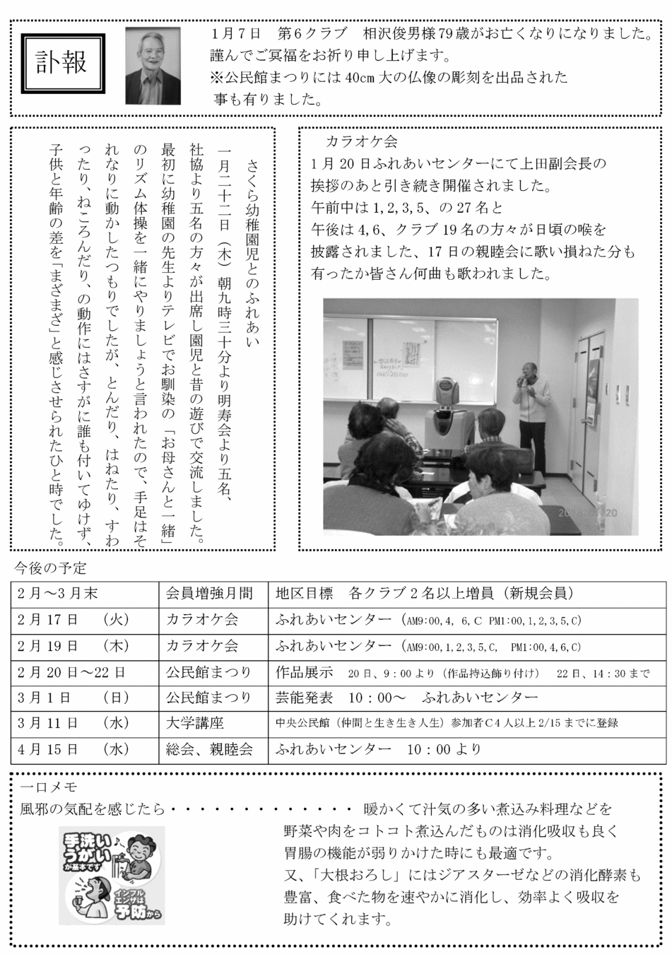 p.1 ☆募ろう ・会員2〜3月は会員増強月間です ・会員を広く募り一人でも多くの会員を勧誘しましょう ・各クラブ2名以上の純増が目標です ☆ゆめクラブ趣味の作品展 ・市民プラザ(1月8〜13日) ・市内二十二地区から多くの作品が出展されました。 ・四之宮地区からは次の方々が出品されました・相原秀子様手芸(干支額飾り)・相川温子様手芸(友禅着物額飾り)・橘川貞子様手芸(チュウリップ飾り)・鈴木一枝様書・後藤政雄様の竹細工の鶴と傘の置物 ☆大野小児童とのふれあい ・1月15日(木)で行われました【以下略】 ☆新年親睦会 ・1月17日明寿会の新年親睦会が開催され138名出席者の元、盛大に行われ楽しい一日でした。次の方々よりご祝儀を頂きました。自治連合会様、神代長子様、高梨妙子様、ファリーショップ田辺様、斉藤正三様、北山茂様、 p.2 ☆訃報 ・1月7日 第6クラブ相沢俊男様79歳がお亡くなりになりました。謹んでご冥福をお祈り申し上げます。※公民館まつりには40cm大の仏像の彫刻を出品された事も有りました ☆さくら幼稚園児とのふれあい ・1月22日(木)朝九時三十分より明寿会より五名、社協より5名の方々が出席し園児と昔の遊びで交流しました。【以下略】 ☆カラオケ会 ・1月20日ふれあいセンターにて開催されました。【以下略】 ☆今後の予定 ・2月〜3月末:会員増強月間 地区目標各クラブ2名以上増員(新規会員) ・2月17日(火):カラオケ会 ふれあいセンター(AM9:00,4,6,C PM1:00,1,2,3,5,C) ・2月19日(木):カラオケ会 ふれあいセンター(AM9:00,1,2,3,5,C, PM1:00,4,6,C) ・2月20日〜22日:公民館まつり 作品展示 20日、9:00より(作品持込飾り付け) 22日、14:30まで ・3月1日(日):公民館まつり 芸能発表 10:00〜 ふれあいセンター ・3月11日(水):大学講座 中央公民館(仲間と生き生き人生)参加者C4人以上2/15までに登録 ・4月15日(水):総会、親睦会 ふれあいセンター 10:00より ☆一口メモ ・風邪の気配を感じたら暖かくて汁気の多い煮込み料理などを野菜や肉をコトコト煮込んだものは消化吸収も良く胃腸の機能が弱りかけた時にも最適です。又、「大根おろし」にはジアスターゼなどの消化酵素も豊富、食べた物を速やかに消化し、効率よく吸収を助けてくれます。 | |
