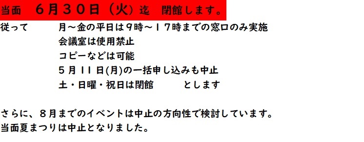 新型コロナウィルス感染症まん延防止の緊急事態宣言を受け、4月9日(木)から5月6日(水休)まで、公民館の施設利用を停止します。