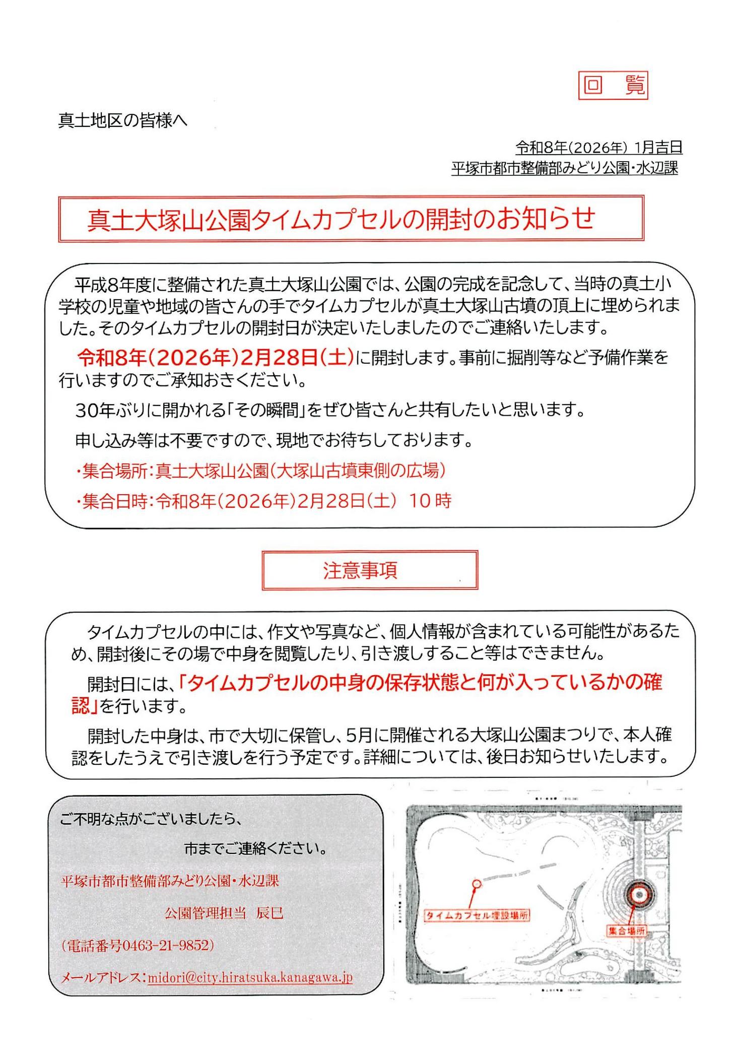 - 2026/01/17 真土大塚山公園タイムカプセルの開封日は令和8年2月28日(土)の10時 【回覧】