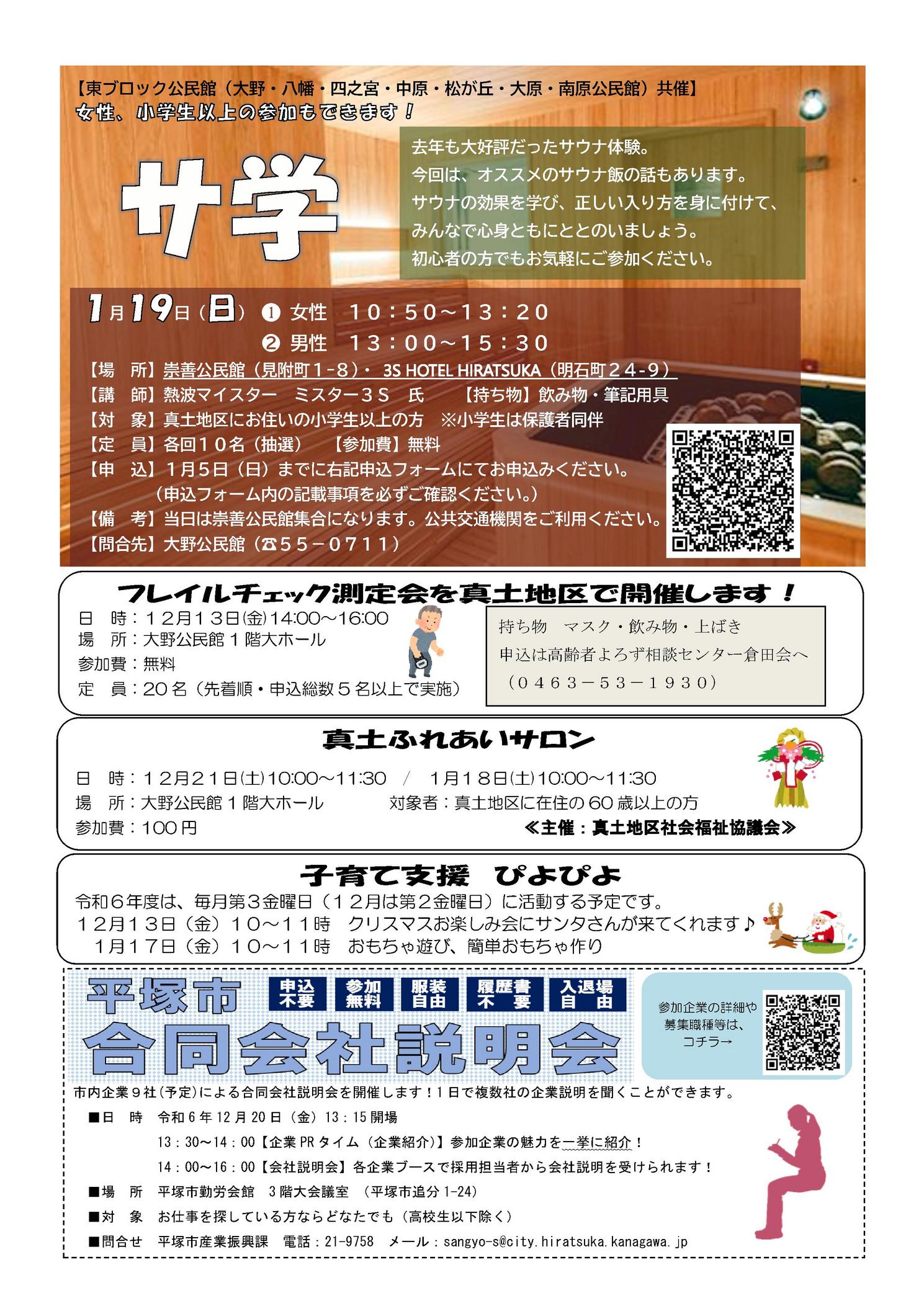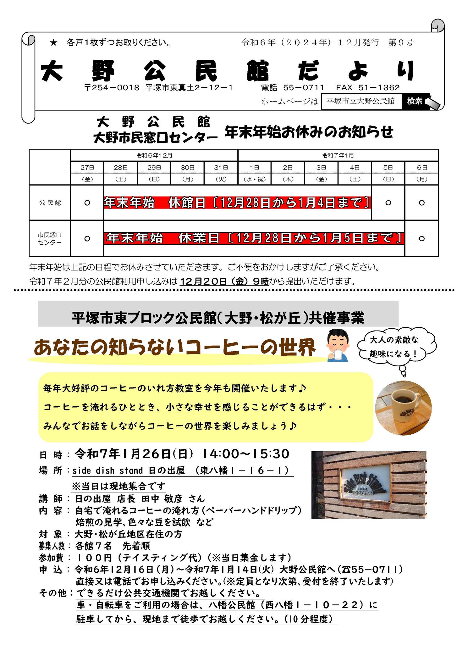 ■大野公民館だより 令和6年(2024年)12月発行 第9号■ 主な内容 ┃ 大野公民館 及び 大野市民窓口センター 年末年始お休みのお知らせ ┃ あなたの知らないコーヒーの世界 ┃ サ学(サウナ体験) ┃ フレイルチェック測定会を真土で開催します ┃ 真土ふれあいサロン 及 子育て支援 びよぴよ 開催日のご案内 ┃ 平塚市合同会社説明会 |