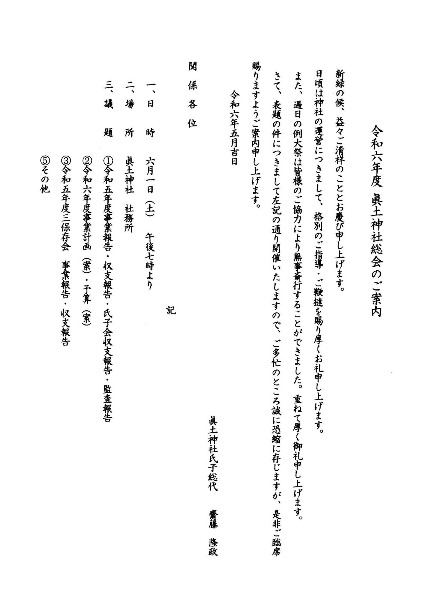 - 2026/03/21 令和8年眞土神社例大祭のご案内 4月11日(土) 式典:午前9時斎行 神輿巡行:午前10時00分から宮出 神輿渡御:午後2時30分より 子供神輿:午後3時30分【回覧】