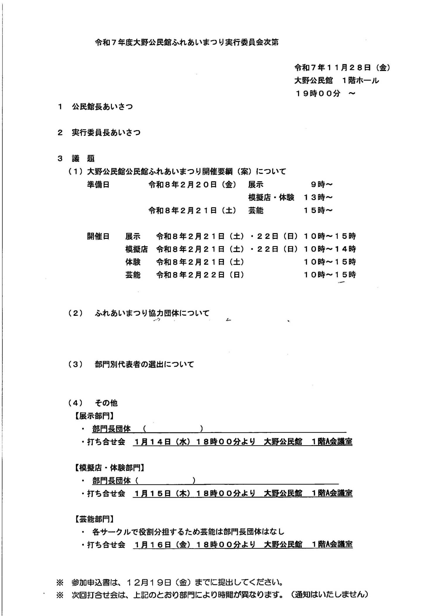 - 2025/12/02 模擬店・体験部門打ち合わせ会 大野公民館ふれあいまつり 1月15日(木)18:00 〜 大野公民館 A会議室 1階