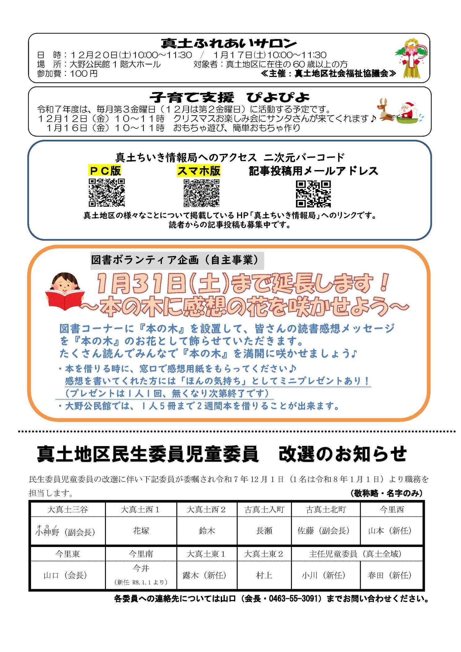 ■大野公民館だより 令和7年(2025年)12月発行 第9号■ 主な内容 ┃ 大野公民館・大野市民窓口センター 年末年始お休みのお知らせ ┃ 親子で参加も大歓迎! サ学 【東プロツク公民館・崇善公民館共催】 ┃ 本の木に感想の花を咲かせよう 1月31日(土)まで延長します! ┃ 真土地区民生委員児童委員改選のお知らせ ┃ 真土ふれあいサロン12・1月開催案内と子育て支援ぴよぴよ12・1月開催案内 ┃ 真土ちいき情報局へのアクセス二次元バーコード (投稿 大野公民館:DK 掲載 情報局:MT) |