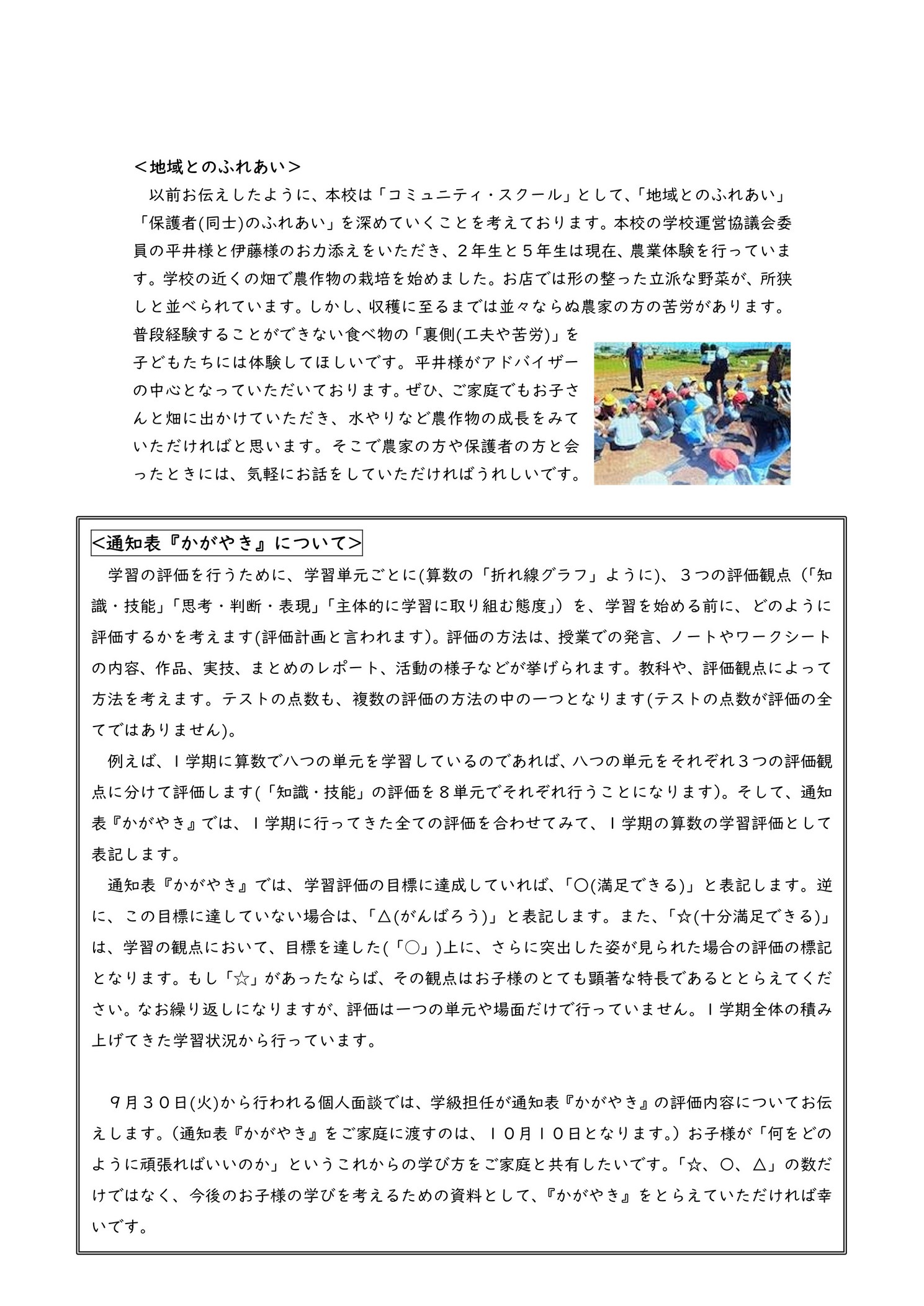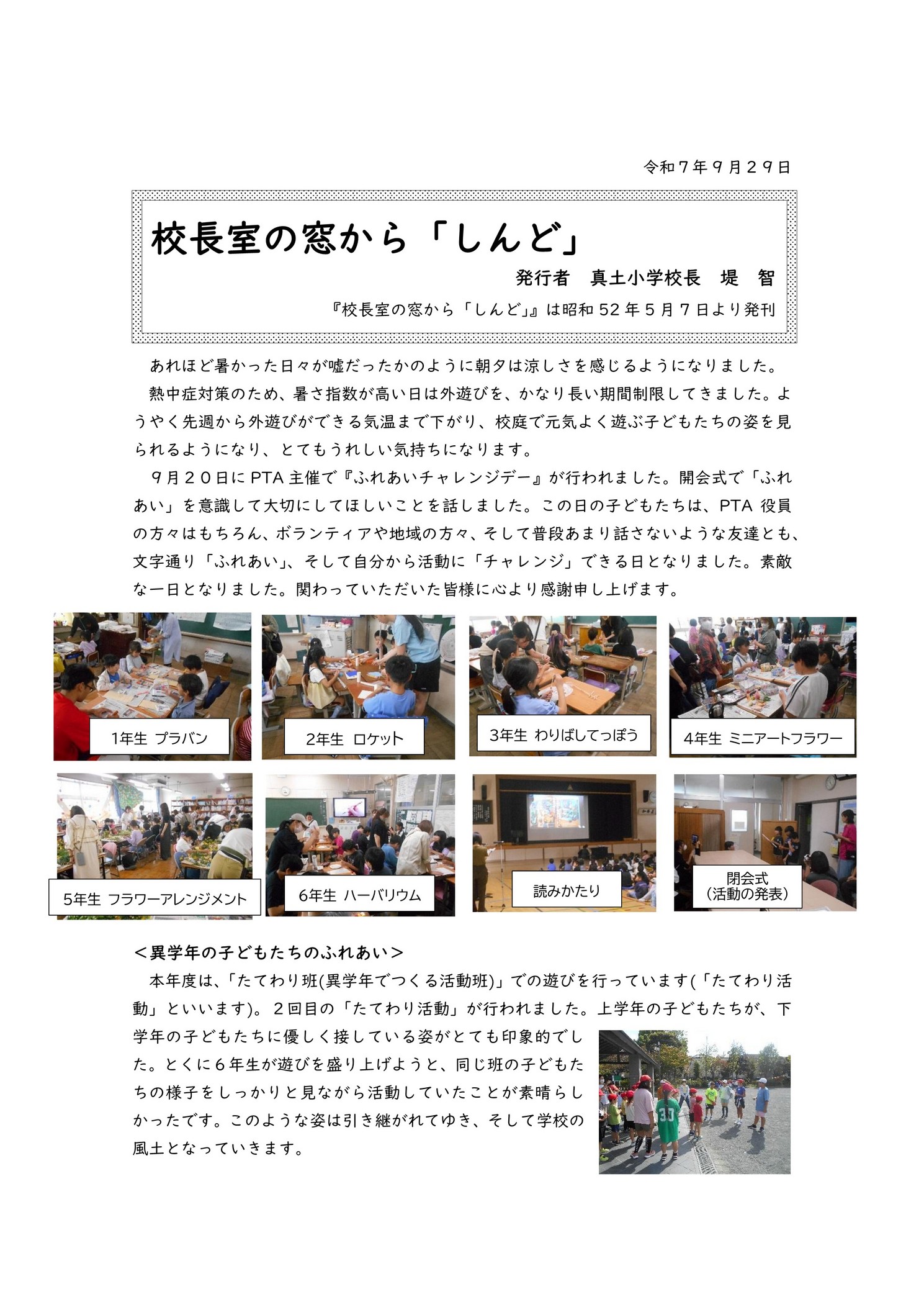 ■ 校長室の窓から 「しんど」 令和7年9月29日 ■ 主な内容 ・ ふれあいチャレンジデー ・ 異学年の子どもたちのふれあい ・ 地域とのふれあい ・ 通知表『かがやき』について (投稿:真土小学校 ST 掲載:情報局TM) 印刷や拡大表示に利用できます ↓ ↓ ↓ |