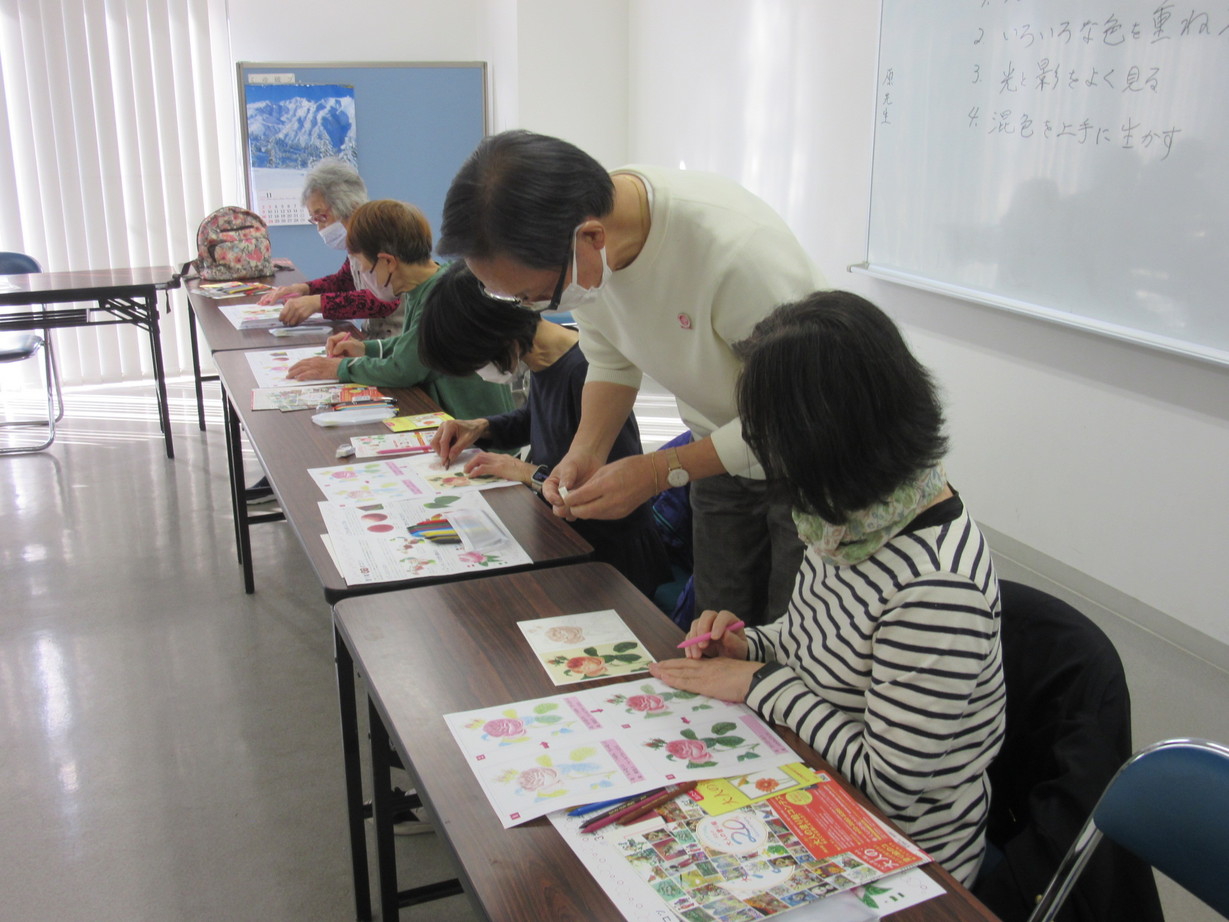 シ ニ ア 学 級 ■ 大 人 の 塗 り 絵 講 座 ■ 11月28日に公民館で「大人の塗り絵講座」を開催しました。 「大人の」と講座名にあるように、ただ色を塗るのではなく、どのようにしたらより素晴らしい色合いが出せるかを講師からコツを教えてもらいながら実践する本格的な講座でした。 今回は「バラの花」の塗り絵にチャレンジしました。 参加者の皆さんからは「塗り絵をやるのは久しぶり!」「だんだんと絵が出来上がっていくのが面白い」「大人も夢中になっちゃうね」と、様々なお声をいただきました。 出来上がった作品はミニフレームに入れてお部屋に飾ることができ、「家のどこに置こうかな♪」とワクワクしてもらいながら講座を楽しんでいただきました。 (取材:MT 掲載:DK) |