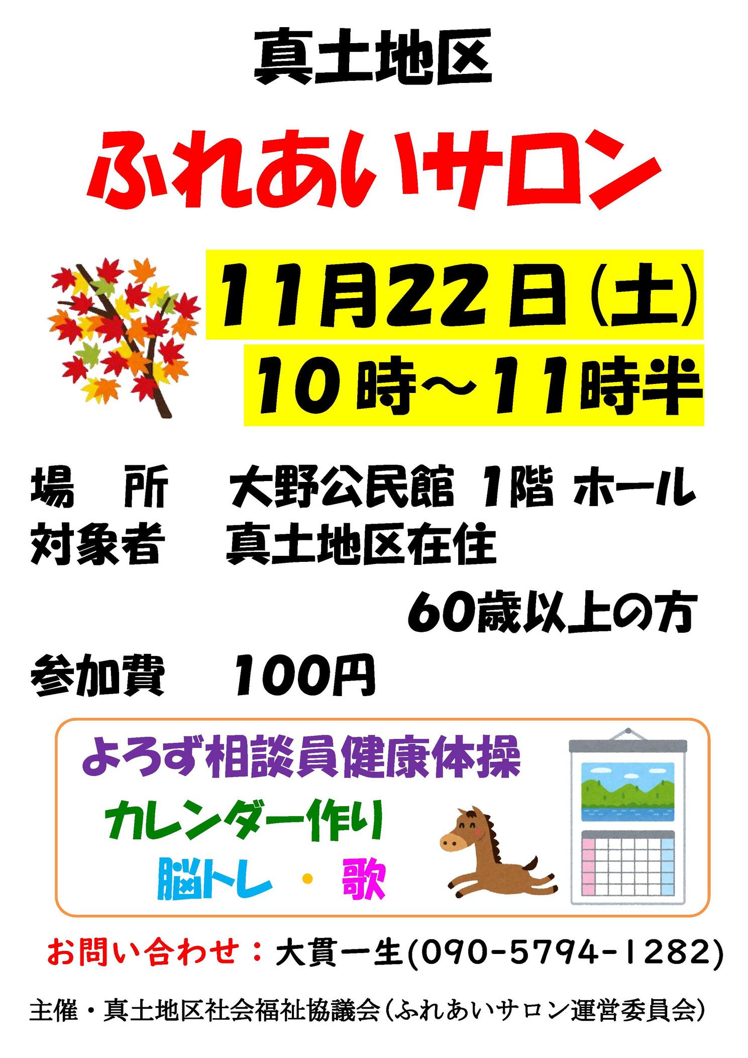 - 2025/10/31 真土ふれあいサロン 11月開催のご案内 11月22日(土) 10時00分 〜 11時30分 大野公民館 1階 ホール