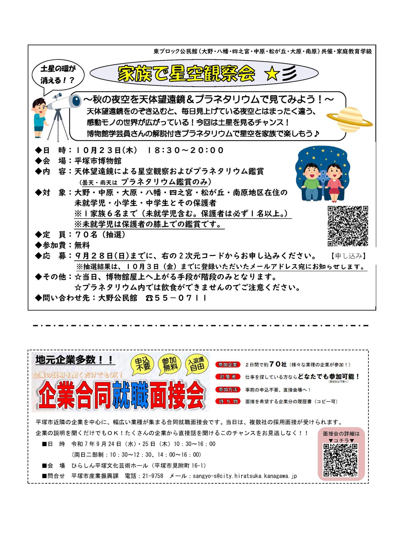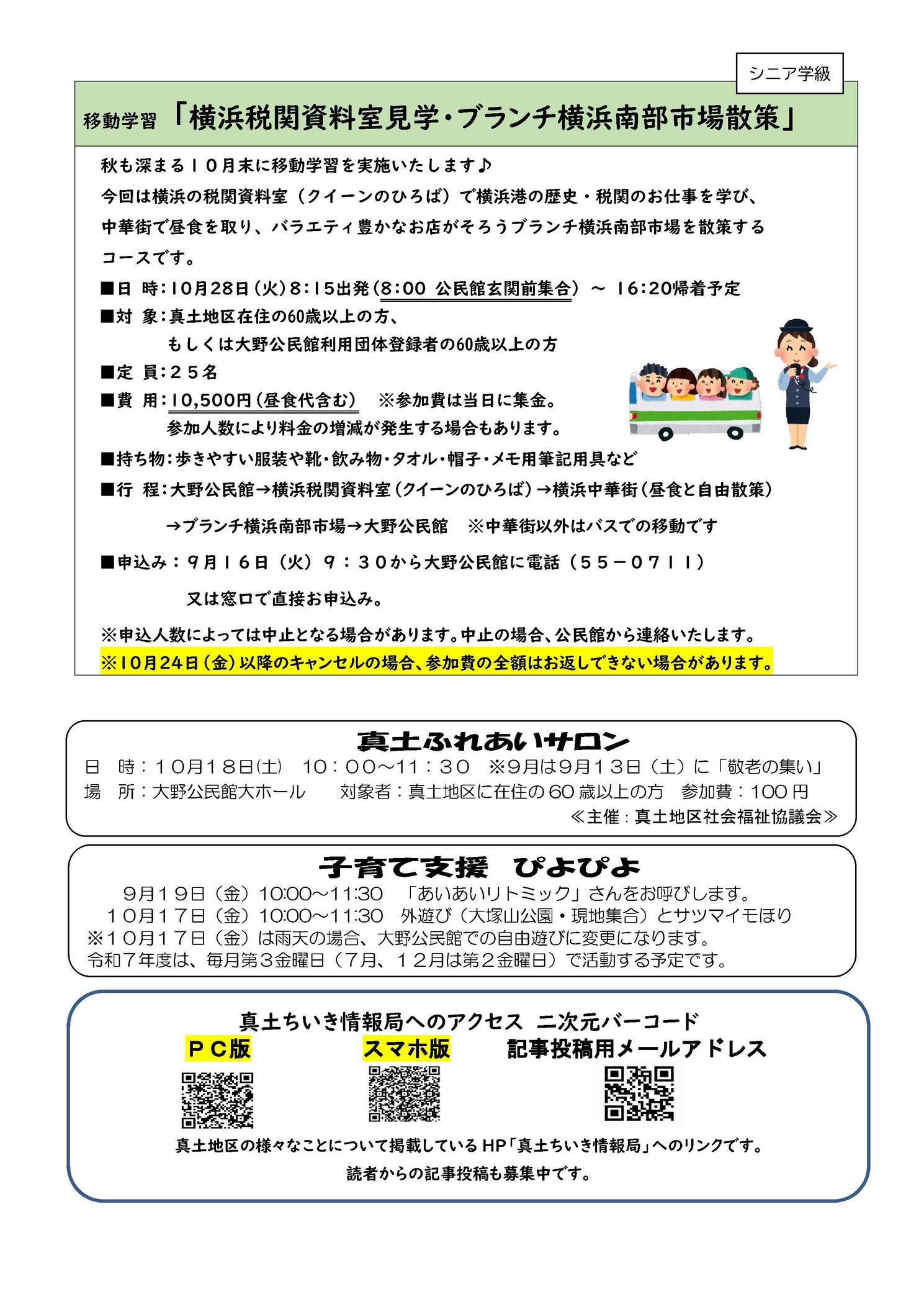 ■大野公民館だより 令和7年(2025年)9月発行 第6号■ 主な内容 ┃ 第72回市民体育レクリエーション真土地区大会のお知らせ ┃ 「横浜税関資料室見学・ブランチ横浜南部市場散策」 シニア学級 ┃ 真土ふれあいサロンと子育て支援 ぴよぴよ 9月と10月の開催案内 ┃ 真土ちいき情報局へのアクセス二次元バーコード ┃ 家族で星空観察会 家庭教育学級 ┃ 企業合同就職面接会 開催案内 ┃ 真土子どもサマーチャレンジスクール たくさんのご参加ありがとうございました (投稿 大野公民館:DK 掲載 情報局:MT) |