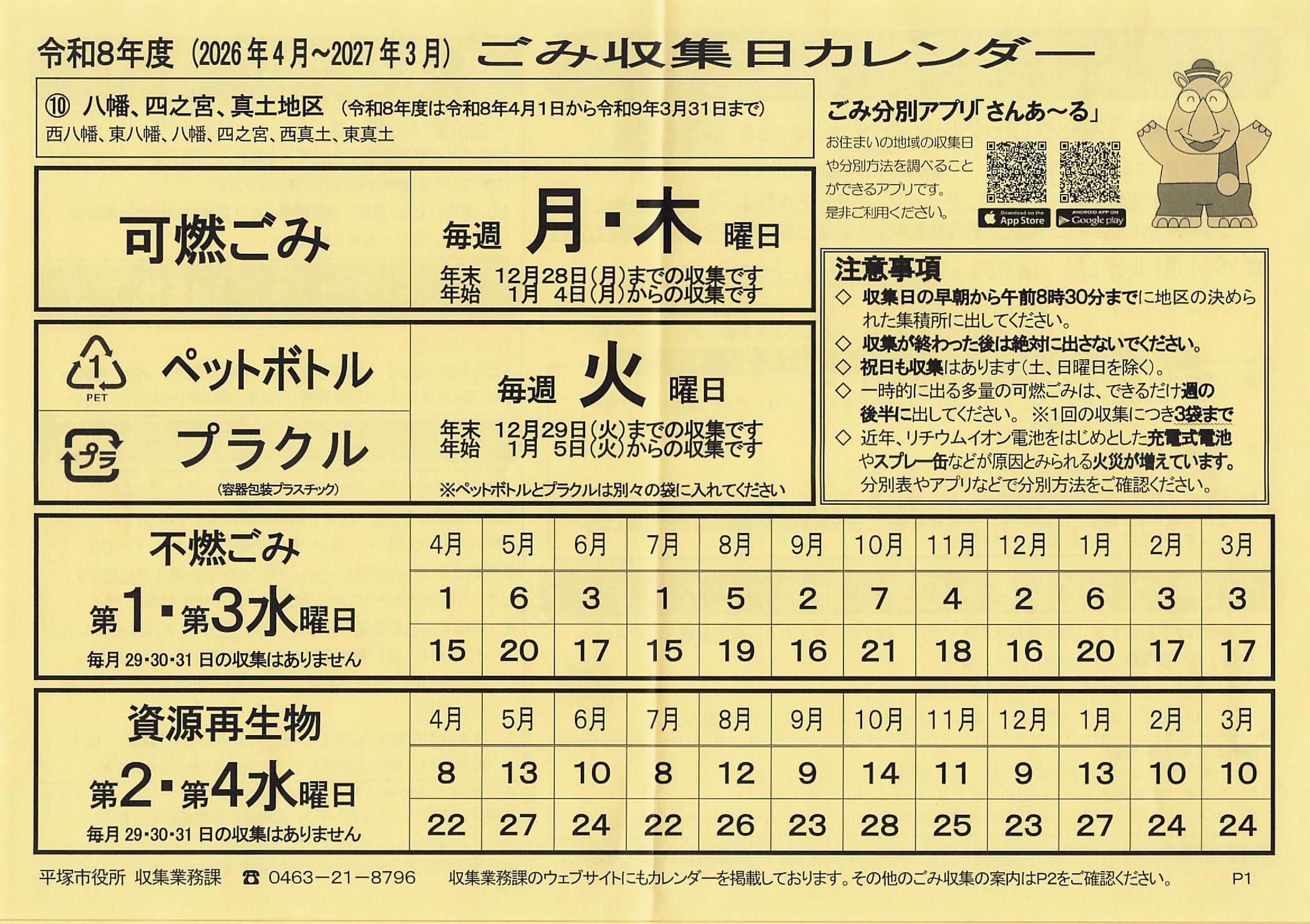 ごみ収集日カレンダー 令和8年度(2026年4月〜2027年3月)