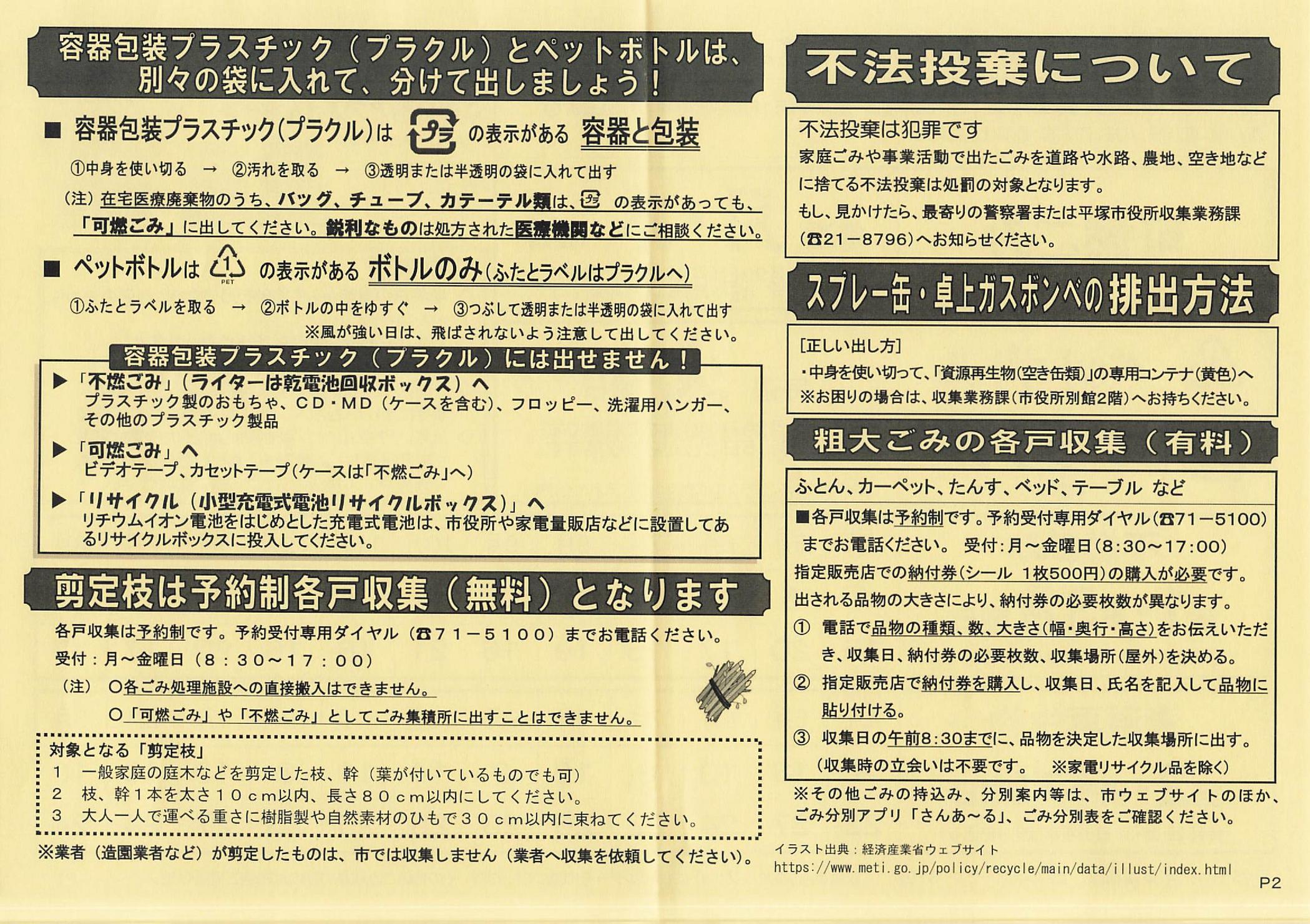 ■ごみ収集日カレンダー 令和8年度(2026年4月〜2027年3月)■ 間違えやすい出し方それは空き缶類 ●缶は、つぶさないで、専用コンテナ(黄色)に出してください 缶がつぶれていると、収集後の処理で、うまく圧着・成形ができなくなります ●スプレー缶や卓上ガスボンベは、使い切ってお出しください。穴あけ不要。中身を使い切ることができないなどお困りの際は、収集業務課までお持ちください。(2018年12月より変更) (投稿掲載 情報局:MT) 印刷や拡大表示に利用できます ↓ ↓ ↓ |