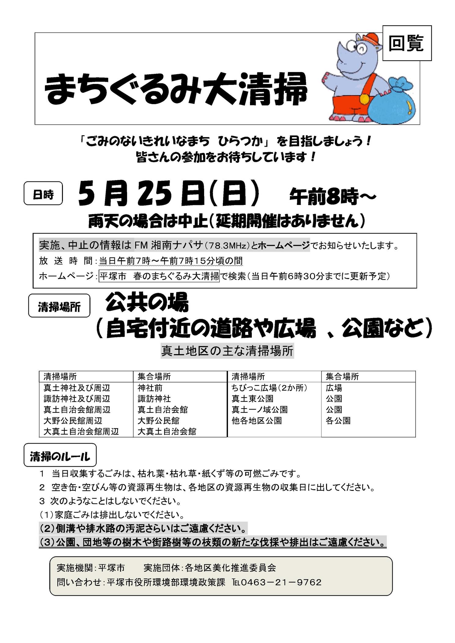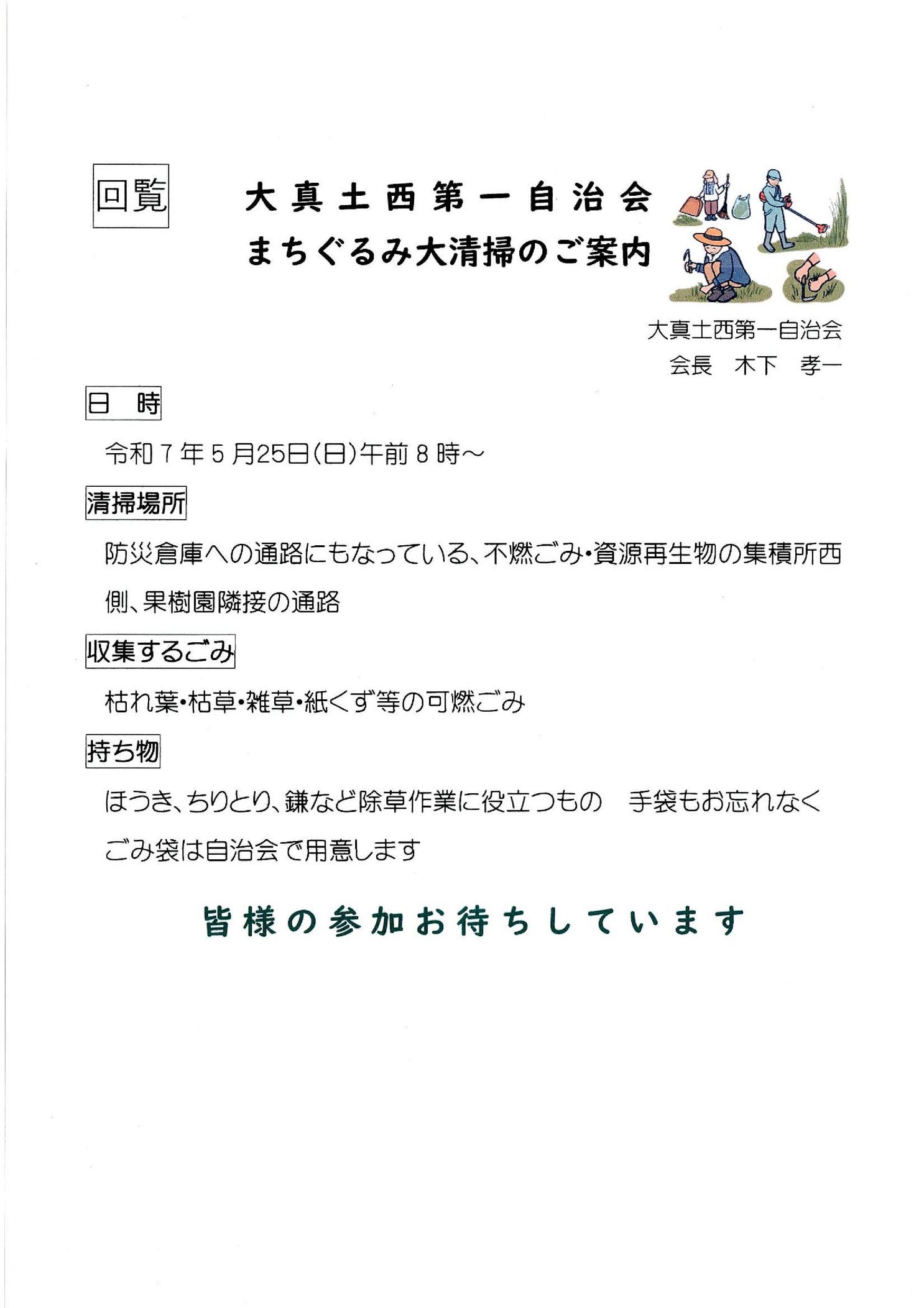 まちぐるみ大掃除について 5月25日(日) 8:00から 各単位自治会指定の公共の場もあります