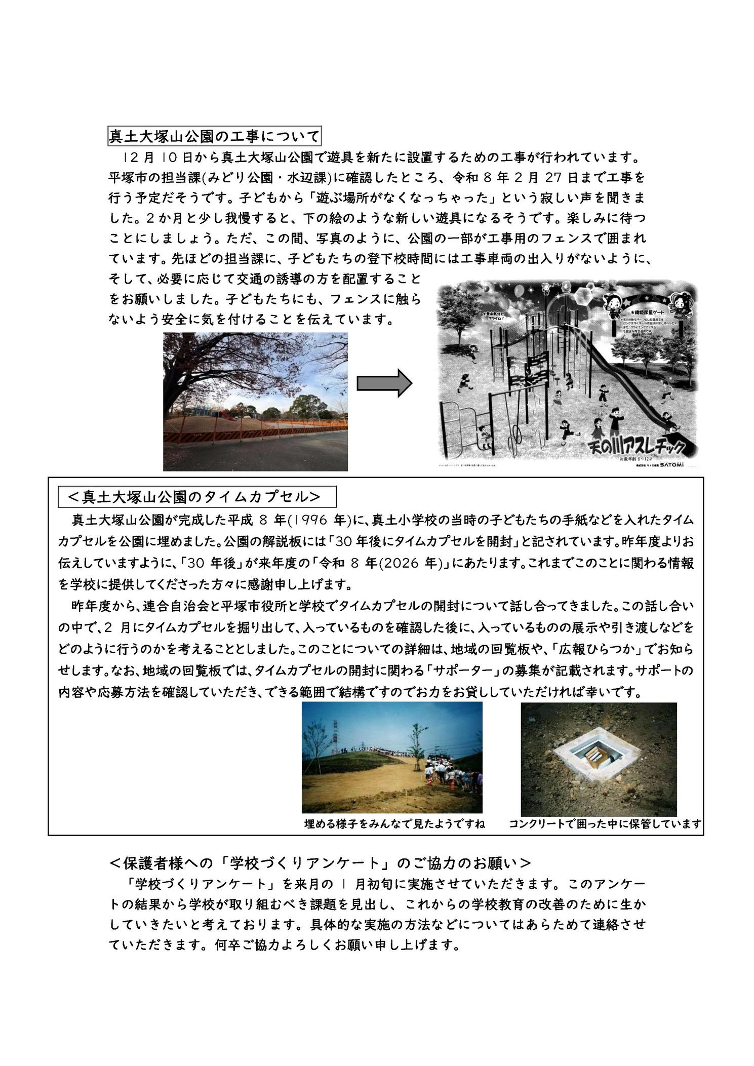 ■ 校長室の窓から 「しんど」 令和7年12月15日 ■ 主な内容 ・ 「2025 年度たのしんど音楽発表会」 ・ 自主防災訓練(11/29)の実施から ・ 真土大塚山公園の工事について ・ 真土大塚山公園のタイムカプセル ・ 保護者様への「学校づくりアンケート」のご協力のお願い (投稿:真土小学校 ST 掲載:情報局TM) 印刷や拡大表示に利用できます ↓ ↓ ↓ |