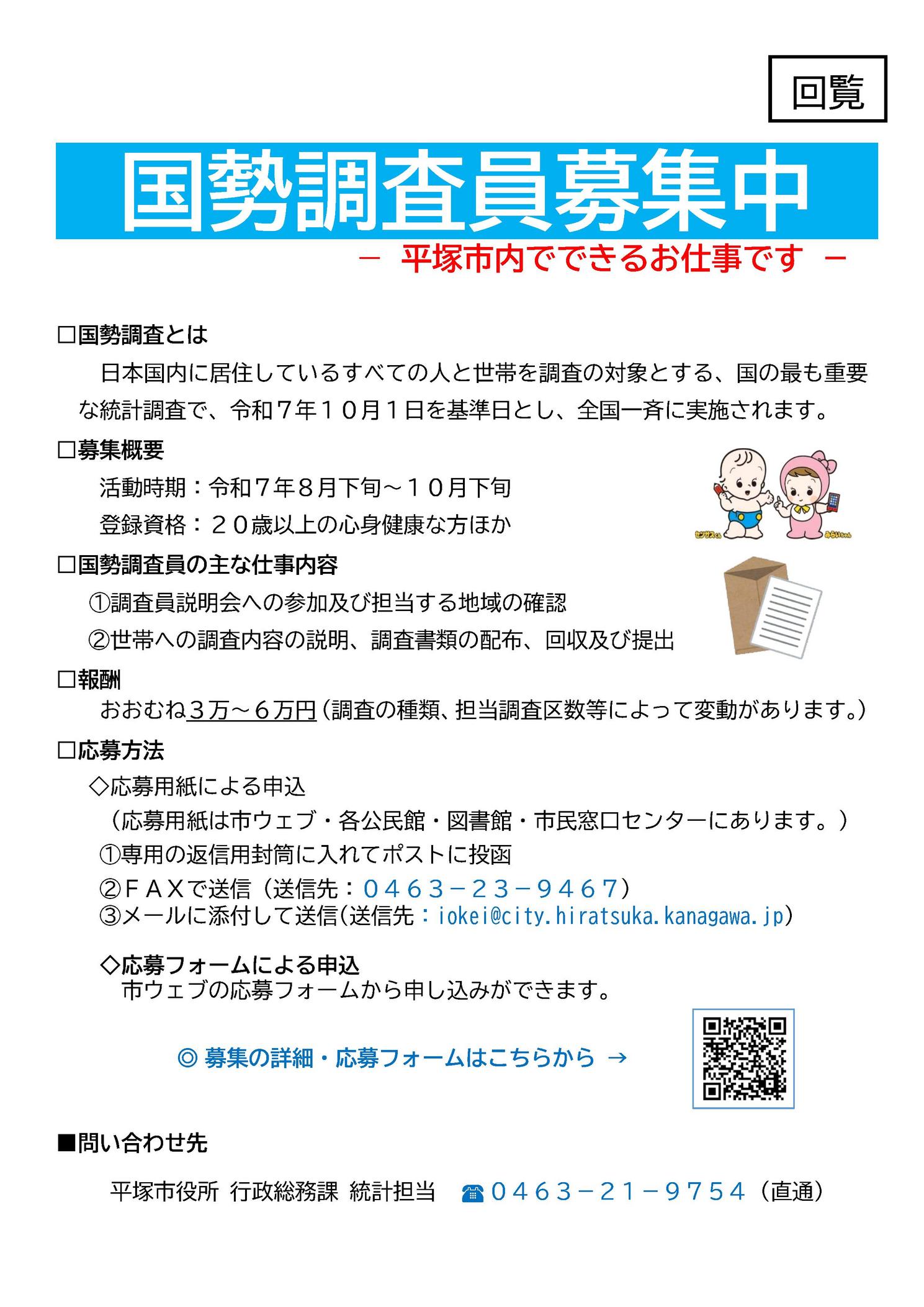 国勢調査員募集中 令和7年 募集概要 活動時期:令和7年8月下旬〜10月下旬 登録資格:20歳以上の心身健康な方ほか