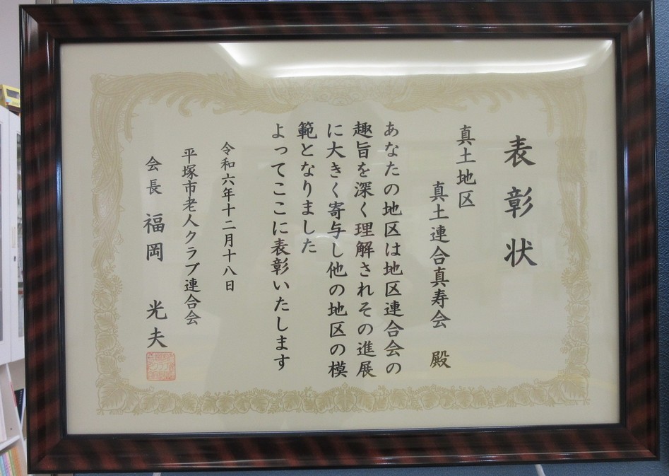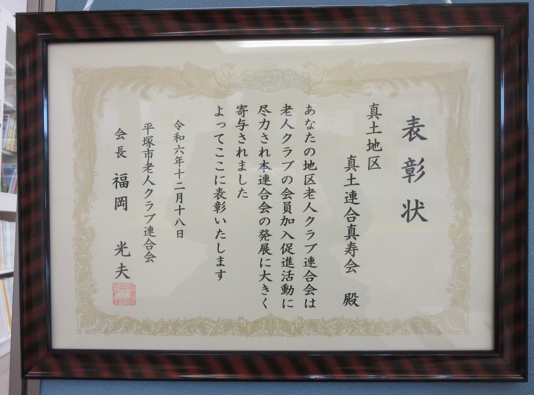 ■真寿会(真土老人クラブ)が表彰されました■ 真土連合真寿会(真土老人クラブ)は真土ゆめクラブ湘南平塚の模範となる地区連合会及びクラブ、加入促進優良地区としても高く評価され表彰を受けました 以下報告いたします 森下昌子 真土連合真寿会会長よりメッセージ 令和6年12月18日に平塚市中央公民館で「第60回ゆめクラブ湘南平塚福祉大会」が行われました。そこで真寿会は模範地区連合会と加入促進優良地区の表彰を市老連の福岡会長からいただきました。 令和5年度から真寿会の会長を皆さんの協力のもと努めてまいりました。この表彰は嬉しく、これからの励みにもなります。 2つの表彰状は大野公民館のホールに飾ってあります。機会がありましたらご覧下さい (投稿:真寿会MM 掲載:MT) ゆめクラブ湘南平塚 |