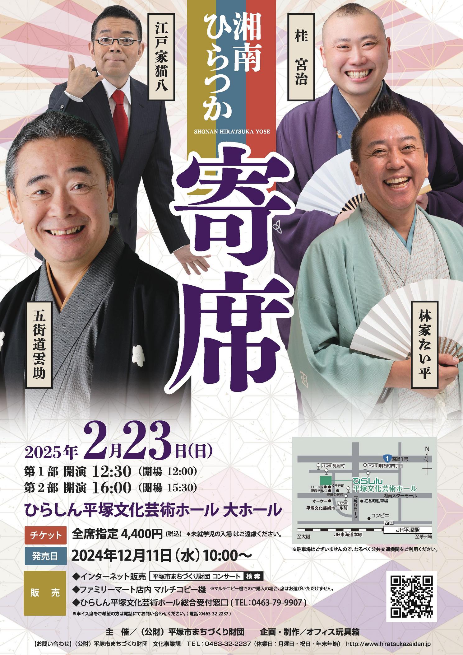 ■ 湘 南 ひ ら つ か 寄 席 ■ 主催/(公財)平塚市まちづくり財団 2025/02/23(日) 開場 第1部12:00 第2部15:30 開演 第1部12:30 第2部16:00 |