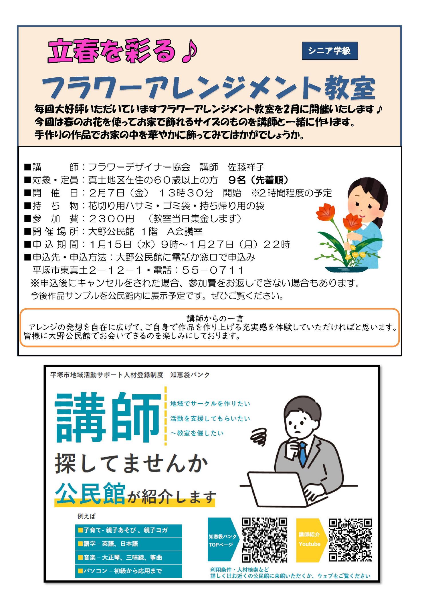 ■大野公民館だより 令和7年(2025年)1月発行 第10号■ 主な内容 ┃ 大野公民館ふれあいまつり 開催のお知らせ ┃ 立春を彩る♪ フラワーアレンジメント教室 シニア学級 ┃ 講師 探してませんか 公民館が紹介します ┃ 子育て支援 びよぴよ 及 真土ふれあいサロン 開催のご案内 |