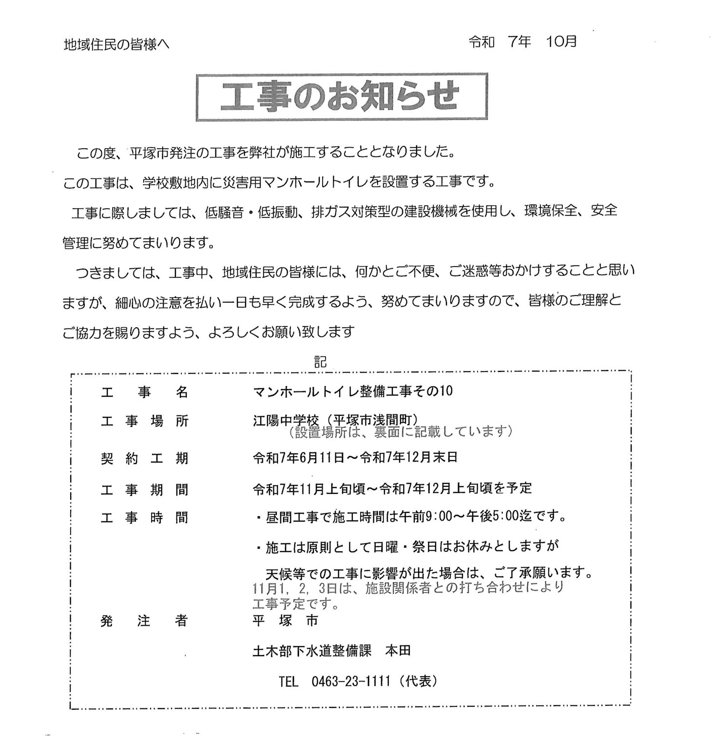 - 2025/10/30 江陽中学校 マンホールトイレ工事のお知らせ