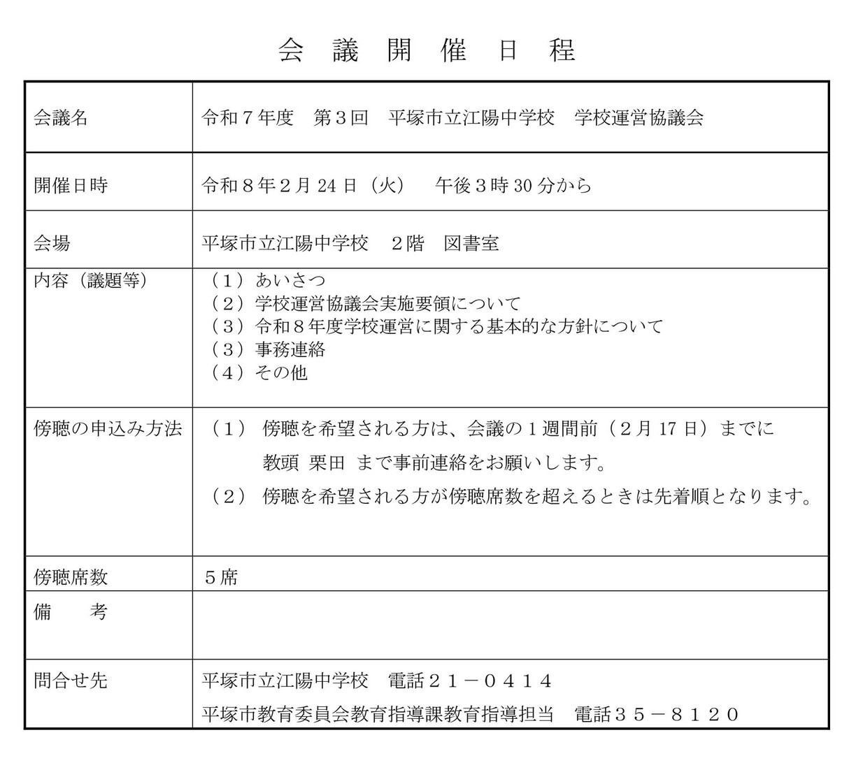 - 2026/02/04 令和7年度 第3回平塚市立向陽中学校運営協議会開催日程