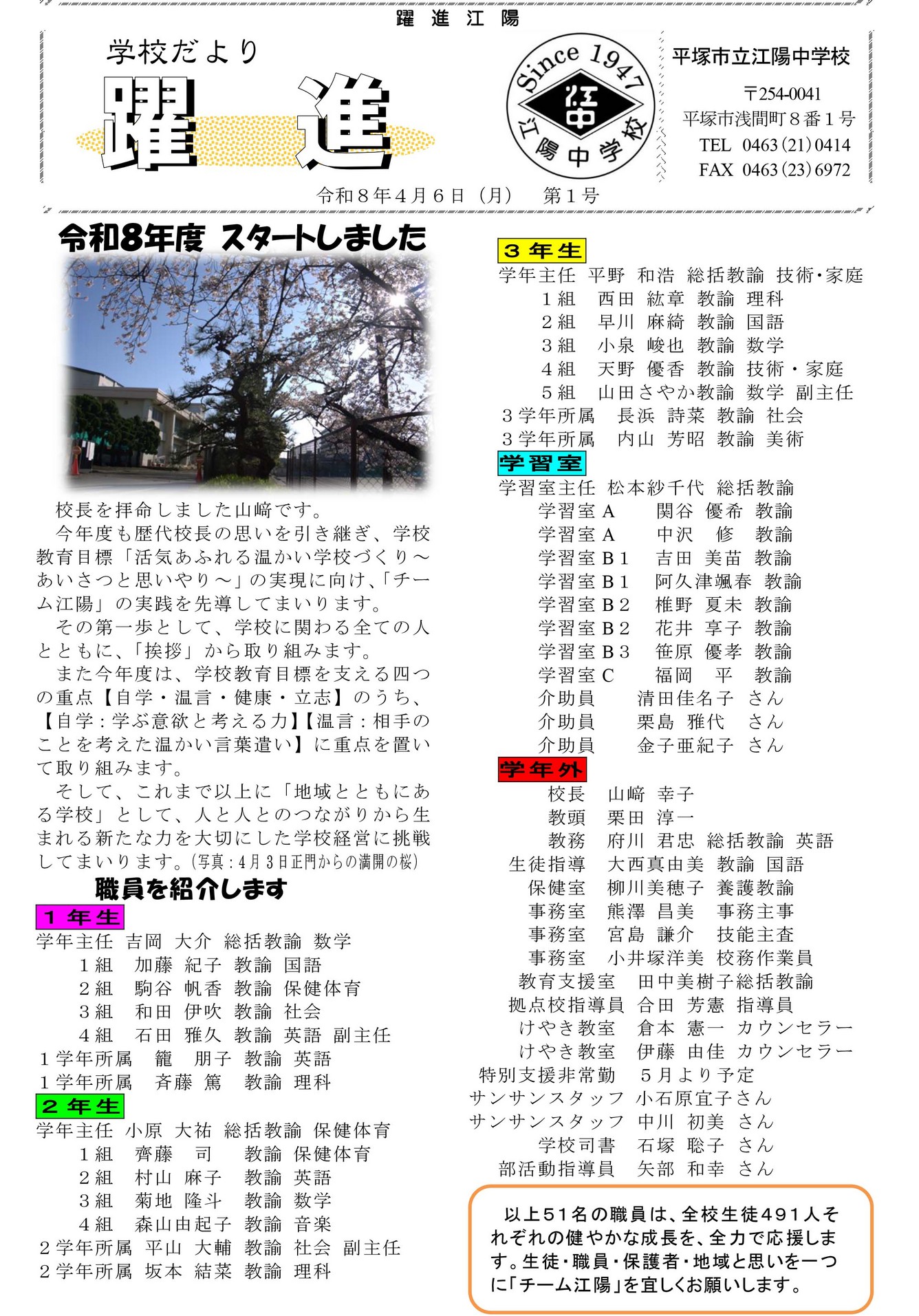 - 2026/04/06 江陽中学校 学校だより / 4月授業予定 / 江陽中公式ガイド2026