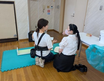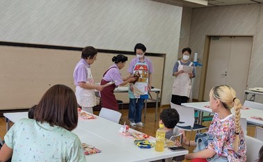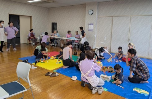9月18日(木)神田公民館の集会室で「体育館であそぼう〜子育てカフェ」が子育て支援部会により開催されました。おもちゃが並んだマットがひかれた室内に、テーブルには子ども用のジュースとお菓子が並び保護者用にはバウムクーヘンと好みのペットボトルを選び、好きに座って楽しむこそだてCaféのオープンです。