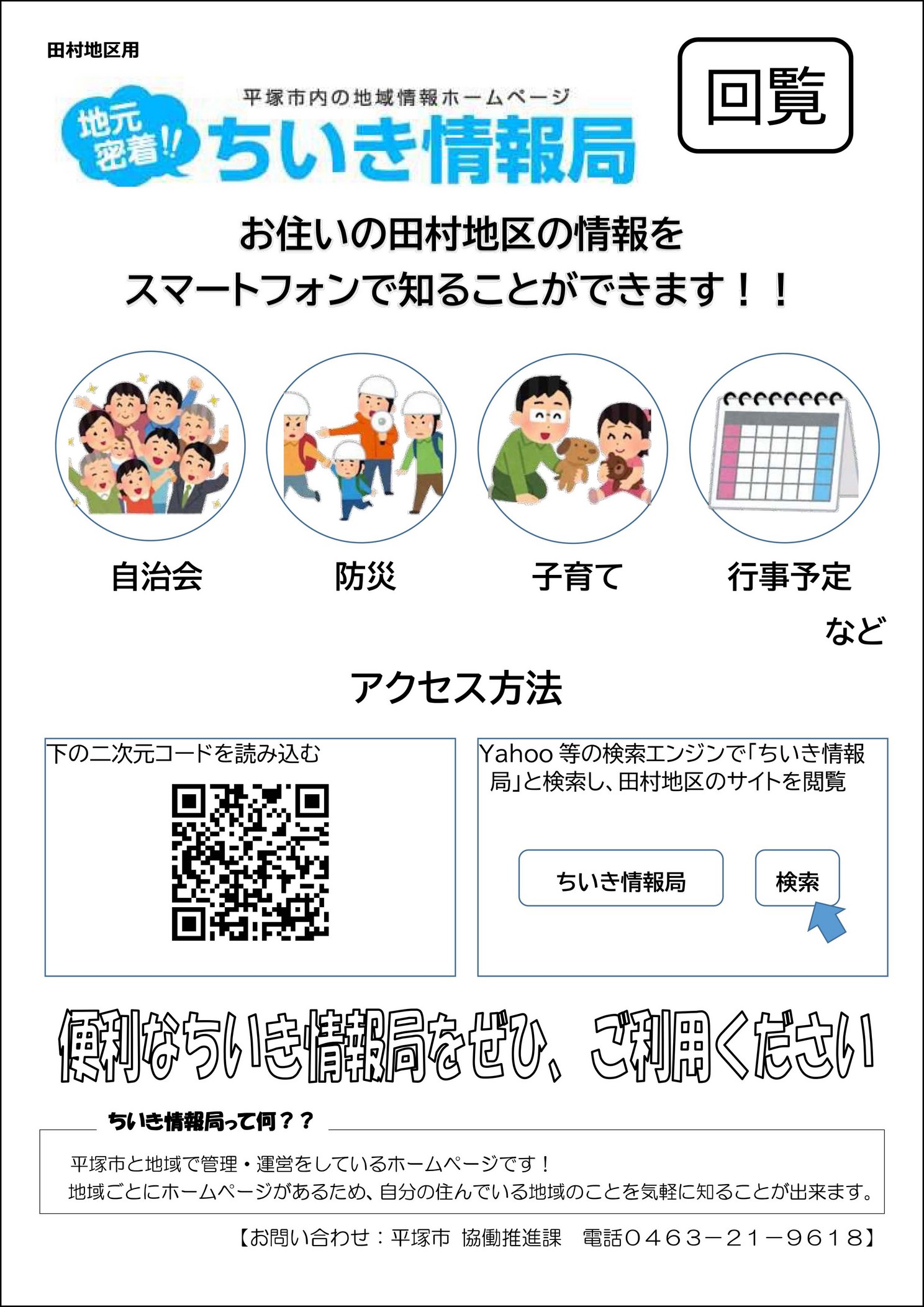 田村は平塚市の北東部・相模川沿いに位置し、西に富士・箱根・丹沢・大山を望む風光明媚な地域です。又、南北に国道129号が通り、自動車販売店・大型電器店・大規模商業施設等で賑わっています。古くは、田村通り大山道、八王子往還の継立場として繁盛し、更に「田村の渡し場」があり、交通・物流の要所として栄えていました。無形文化財の田村囃子と印場踊りや、鎌倉武将・三浦義村館跡等の旧跡もあります。明治22年に神田村となり、昭和31年に平塚市と合併し自治会活動、福祉活動、その他各種団体の地域活動も盛んです。地区には平塚市の聖苑(火葬場)があり市民生活に役立っています。