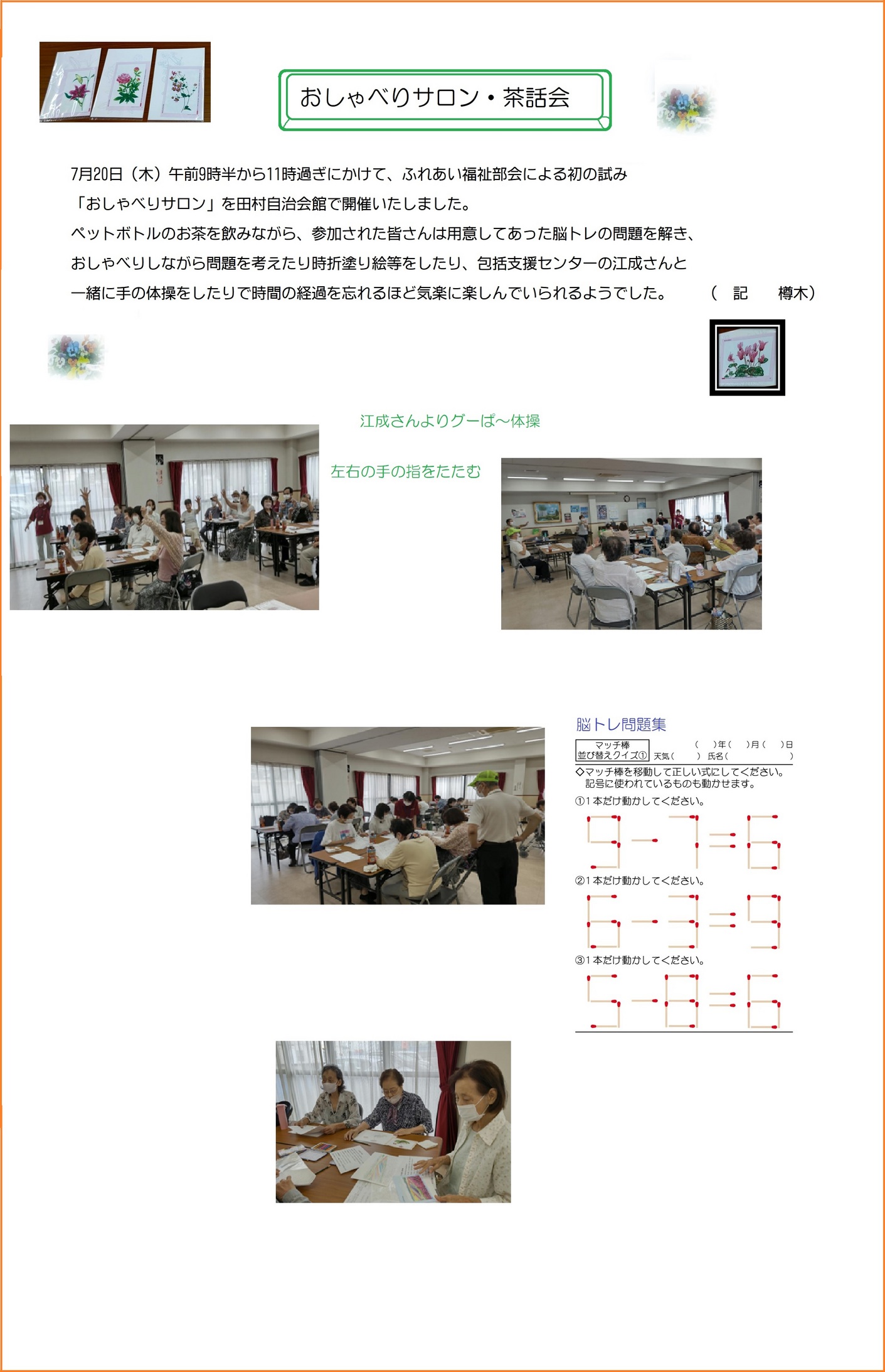 『わたしの田村』HP運営委員会 7月度議事録 ・日 時:2023年7月26日(水)19:00〜 ・場 所:田村自治会館 ホールA ・出席者:内藤、四宮、柳澤、貫木、菅野、清水 八尋(記) ・議 題 1.投稿内容確認 特に問題なし ※コンテンツ投稿件数:7月 22件 2.その他 ※過去の投稿記事の傾向(行事の予定、実施報告等)を 確認してみる。今後の活動に活かせるか。 ※次回運営委員会:次回は8月30日(水)18時より親睦会 を予定していますのでよろしくお願いします。 「わたしの田村」に関しての、お問合せやご質問は watashino-tamura@mf.scn-net.ne.jpにメールをお願いします。 |
