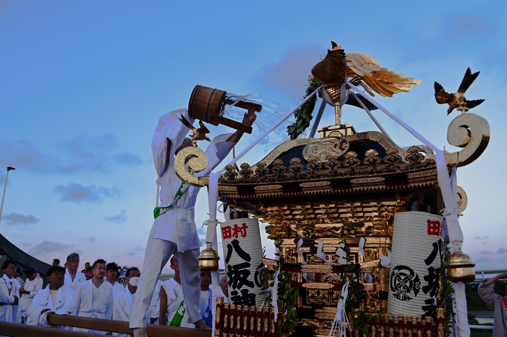 四年振りに行われた田村八坂神社例大祭はメチャ大いに盛り上がり盛大に執り行われました。多くの町民がこの例大祭を待ち焦がれていた証でしょう。12時30分に渡御が始まり渡御行列は大山街道から町内を練り歩き、禊を済ませ19時30分頃に多くの町民が待ち無形文化財の田村ばやしの大演奏の中で宮入最高潮となりました。@大山街道A禊B宮入C最高潮。 <河野>