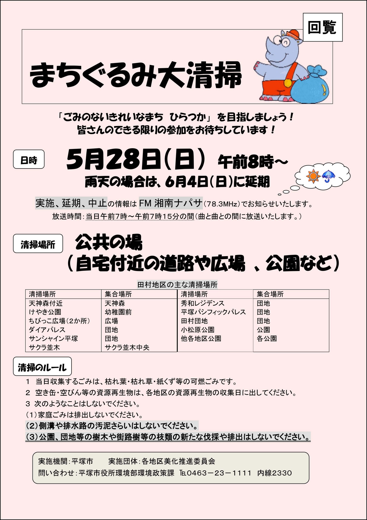 田村は平塚市の北東部・相模川沿いに位置し、西に富士・箱根・丹沢・大山を望む風光明媚な地域です。又、南北に国道129号が通り、自動車販売店・大型電器店・大規模商業施設等で賑わっています。古くは、田村通り大山道、八王子往還の継立場として繁盛し、更に「田村の渡し場」があり、交通・物流の要所として栄えていました。無形文化財の田村囃子と印場踊りや、鎌倉武将・三浦義村館跡等の旧跡もあります。明治22年に神田村となり、昭和31年に平塚市と合併し自治会活動、福祉活動、その他各種団体の地域活動も盛んです。地区には平塚市の聖苑(火葬場)があり市民生活に役立っています。