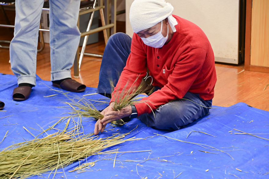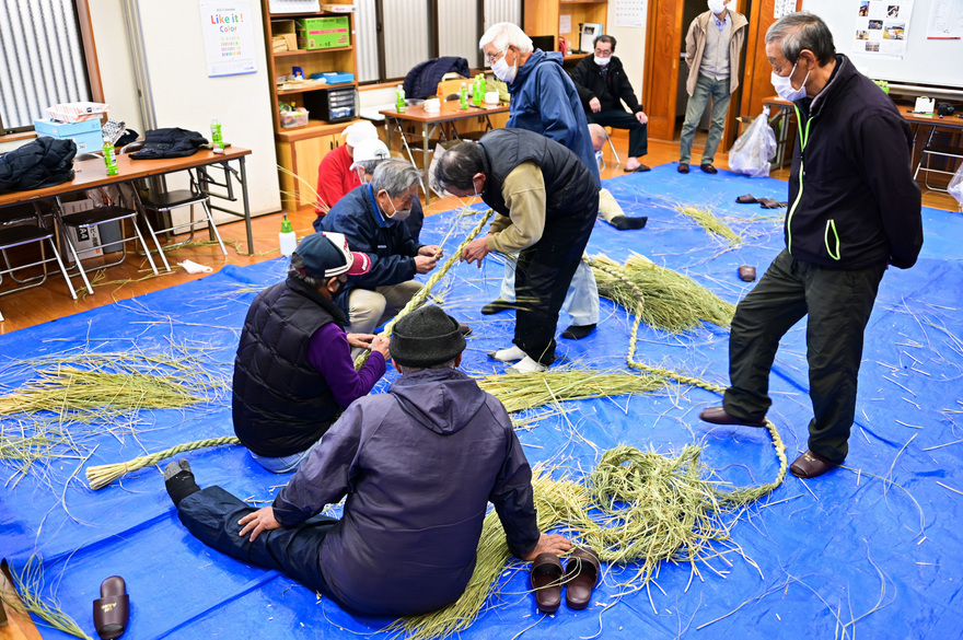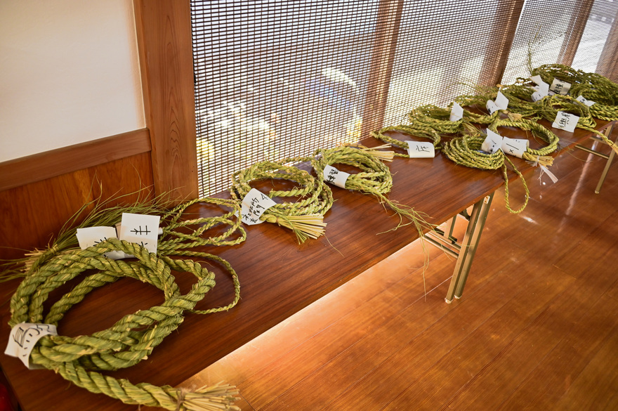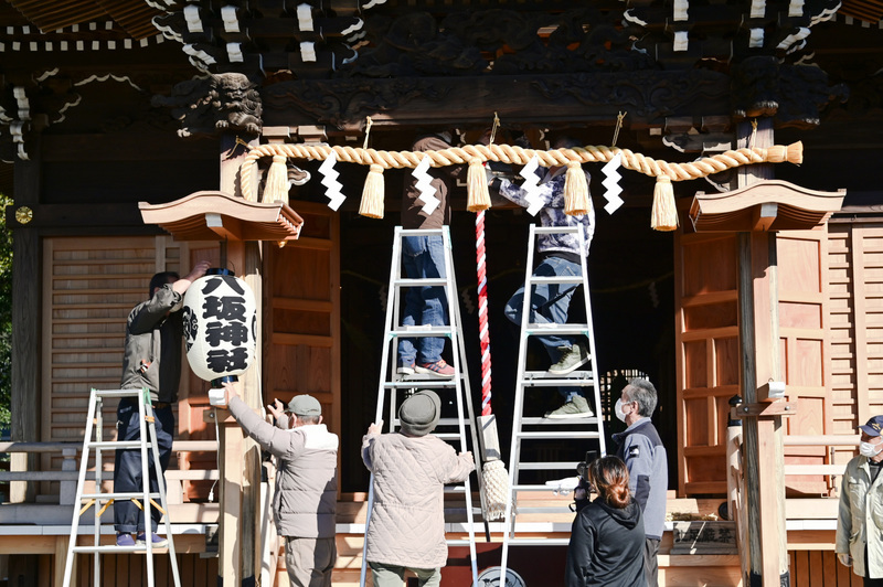 年末の風物詩でもあり八坂神社の伝統行事でもある注連縄つくりが今日(15日)八坂神社伝統継承会(会長福島氏)のメンバーの皆さん(本日の参加者19名)で行われました。長いものは神楽殿の9m短いものは境内社の90cmで皆で役割分担をしてコロナ禍が収まり「良い年を迎えられます様に」と願いを込めて合計25本の製作でした。お疲れ様でした。 <河野>