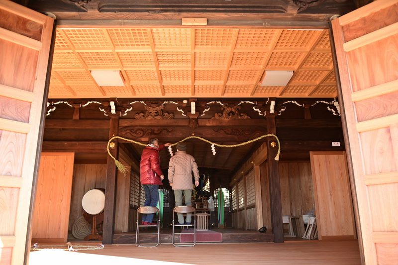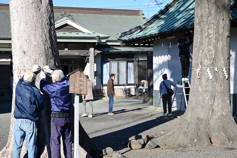 今日は朝から先日手作りした注連縄の取替を八坂神社伝統継承会の方々が中心となって行われました。とてもご高齢とは思えない身の軽さで梯子や脚立に登って手際よく新しい注連縄に取り変わりました。そのほか高張提灯やテントも張られ正月準備は万端です。@鳥居。これより境内ですという目印。真ん中は神様の通る道。端で「お邪魔します」と一例して通りましょう。A本殿内は神殿.拝殿それぞれに注連縄を飾ります。B本殿には特別大きな注連縄。そして鈴の緒も真新しくなりました。鈴−諸説有りますが清々しい音色で参拝者を祓い清め神霊の発動を願う。Cご神木のむくのきとけやきは胴回り3m以上。平塚市の保存樹です。D境内には四社の末社が祭られています。それぞれにも注連縄を飾りました。(文中一部神社本庁から引用) <河野>